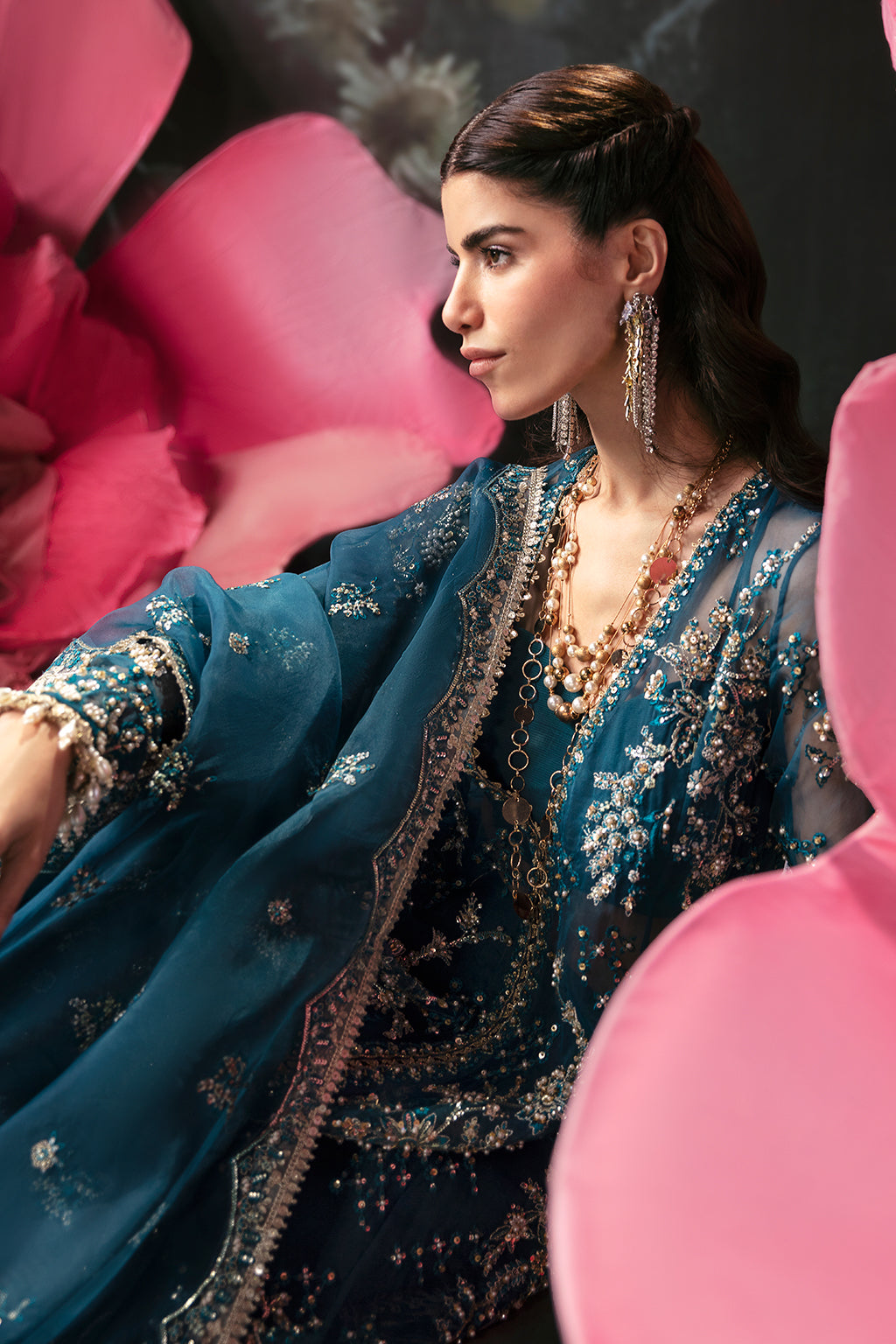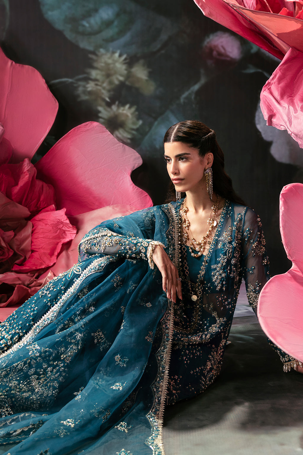 Dress to impress in this stunning gown crafted from teal organza fabric, featuring intricately embroidered panels hand-embellished with cut dana, pearls, and baithki. The gown boasts full-length fitted sleeves for an elegant touch. It is completed with an embroidered organza dupatta adorned with a sequins border detail, paired elegantly with flared pants.