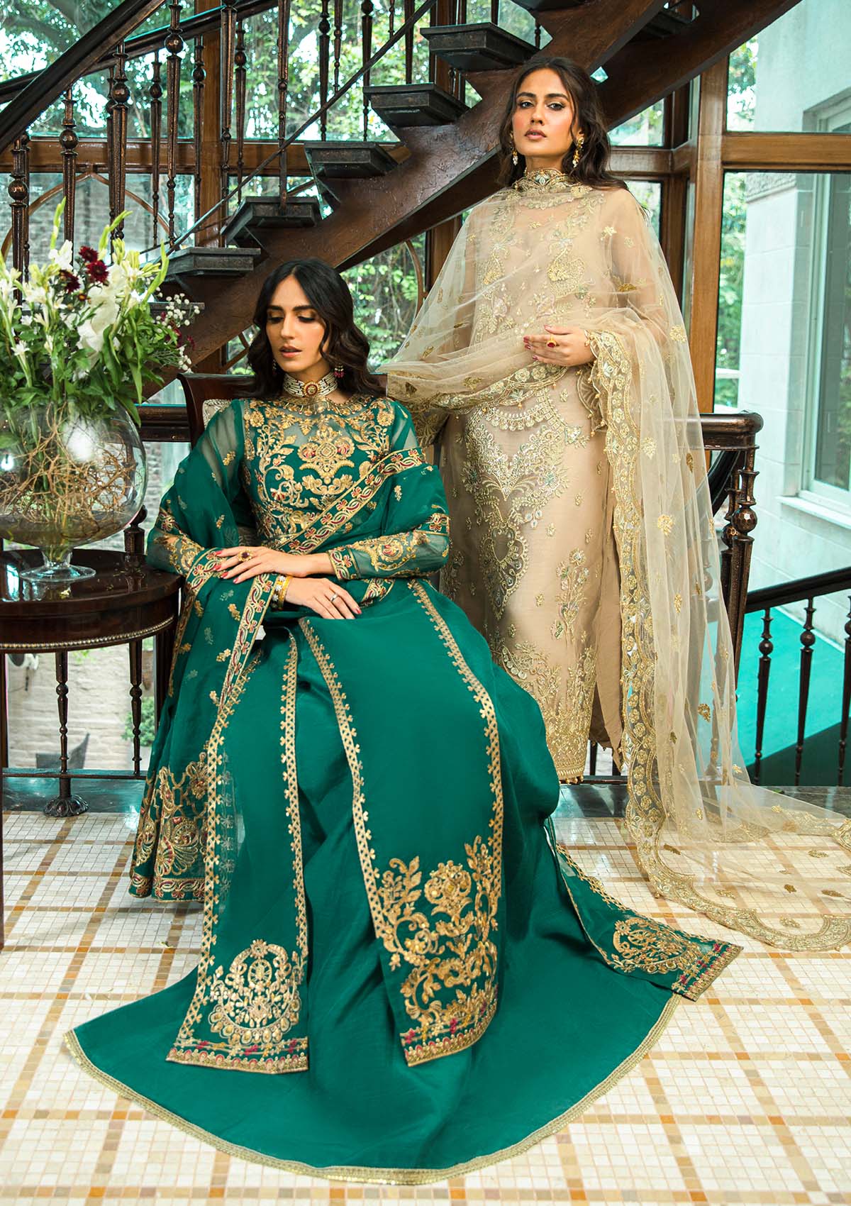 Set on a light taupe tulle base, with frilled organza hems, this Look features an elongated and bejewelled neckline intertwined with floral arrangements. Shimmering French cut sequins enhance the intricate patterns on the kameez with hints of blooming pastels hidden in the motifs.