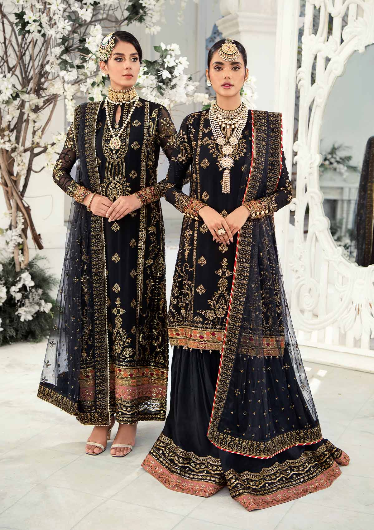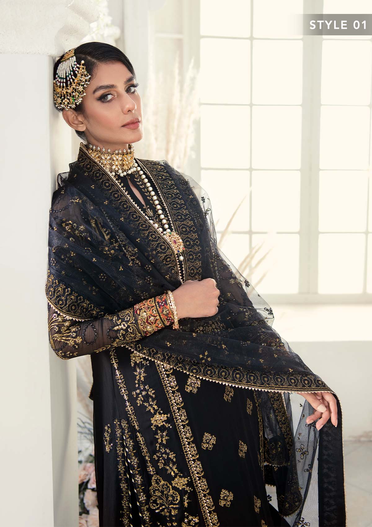 A recurring theme in AIK designs has been a fusion of black and gold. Bringing back the most versatile fabric, delicate and soft chiffon is embroidered with antique gold tilla and sequins. The chatta patti inspired hems and a traditional jaal chatta dupatta keep in pace with the timelessness of this design.