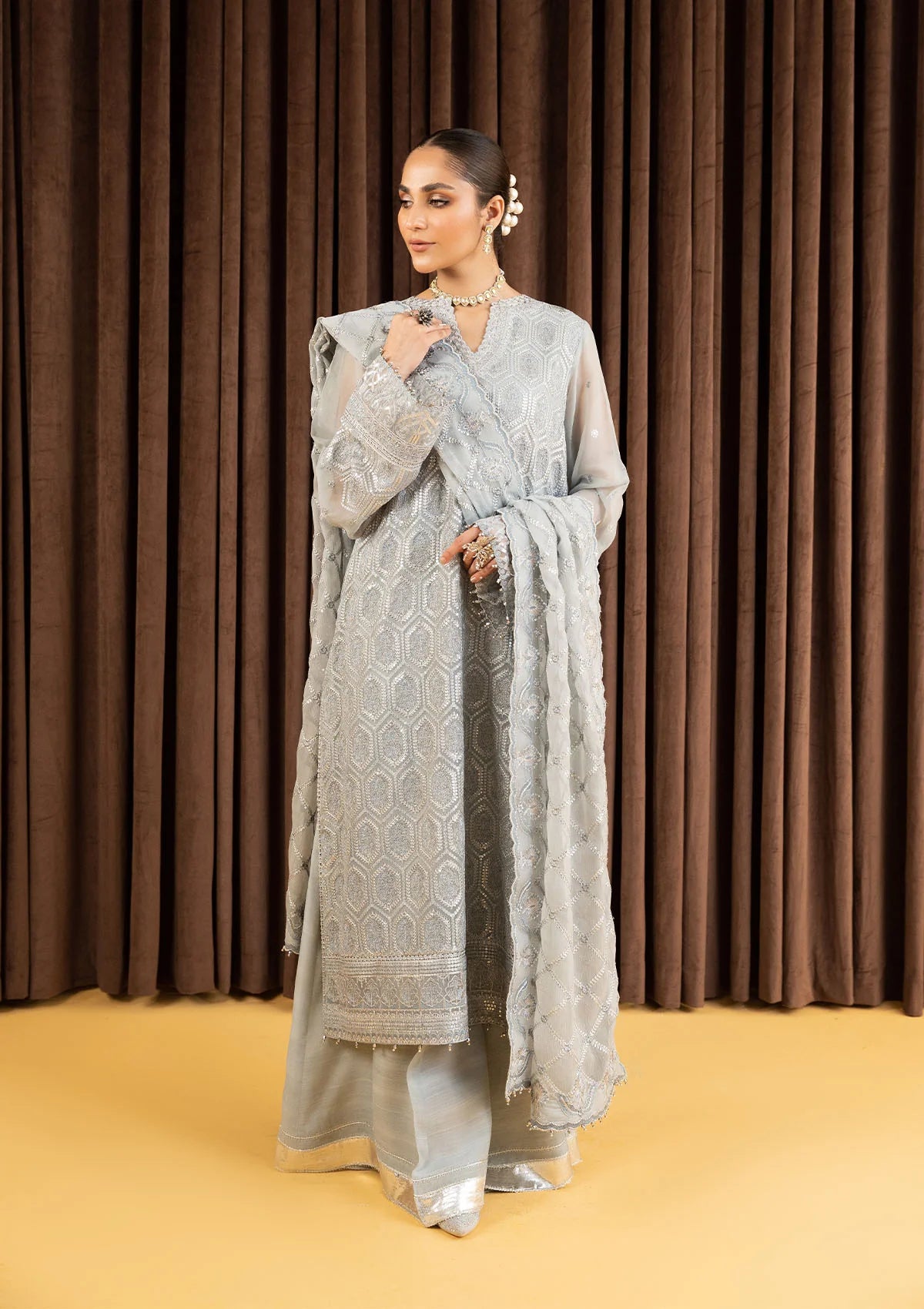 A beautifully curated design on net features classic embroideries in accent hues of sequins and thread on a dark blue canvas. Paired with a tonal embroidered dupatta this look is enhanced with embroidered trouser.
