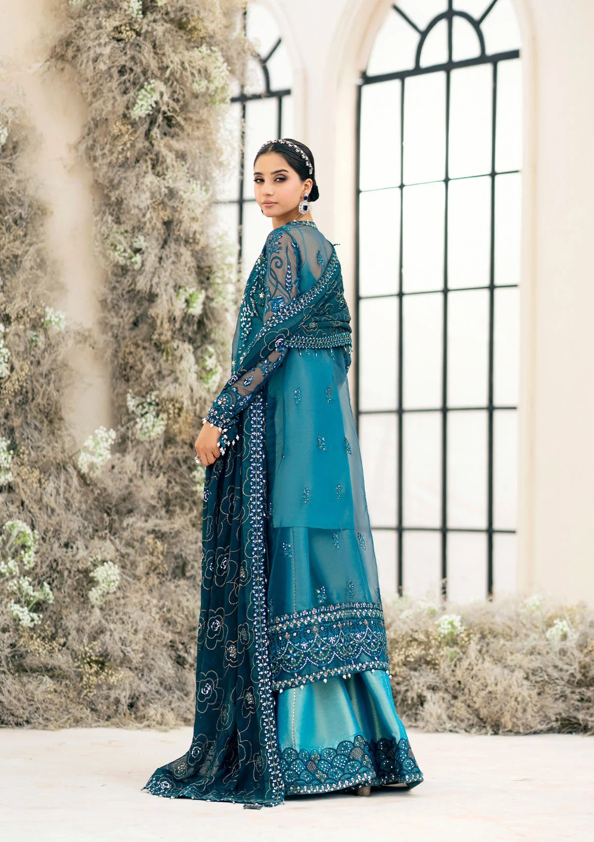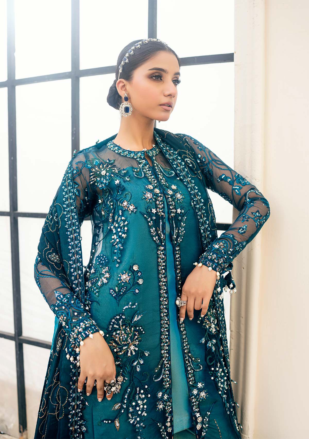 Evoking the fantastical drama of Rococo, the teal organza fabric serves as a canvas for a stunning composition of delicate silver sequins and pearls gracefully meandered across the fabric. Lace detailings frame the asymmetrical and organic florals with pearl accents, complementing the teal hue beautifully. To complete the look, the chiffon dupatta is enveloped in a delicate sequin border, with strikingly lustrous masoori pants.