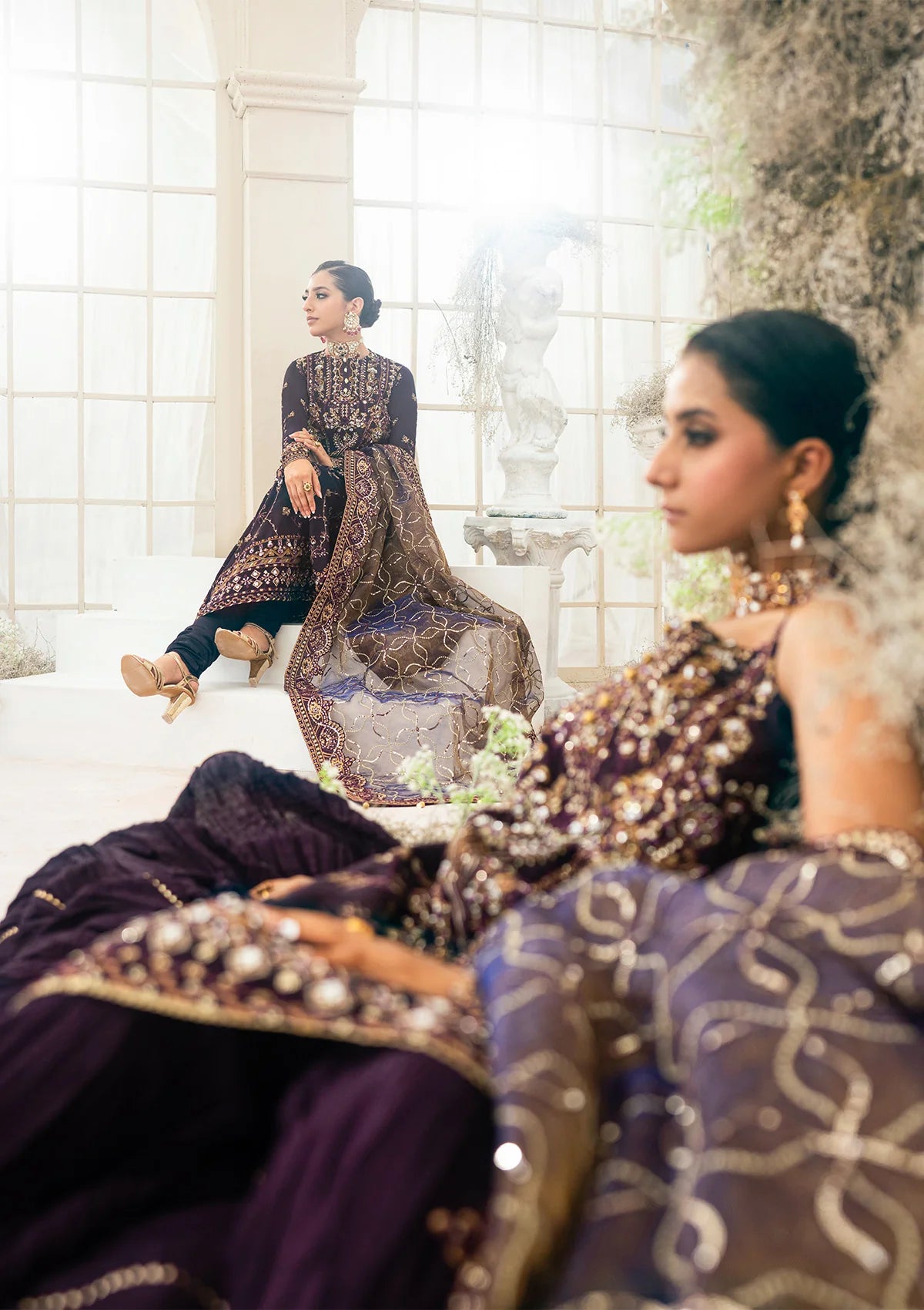 A deep amethyst ensemble with a bejewelled neckline that stands as the radiant centrepiece of the Look. Each motif, like a jewel, runs across the kameez, meticulously embroidered with dark-hued resham threads and gleaming gold tilla. The neckline and hems are canvased by two-toned metallic embellishments and accents of purple beadwork. The masoori organza base of the dupatta has a delicate jaal derived from Rococo patterns which has been constructed using single stitch sequins.