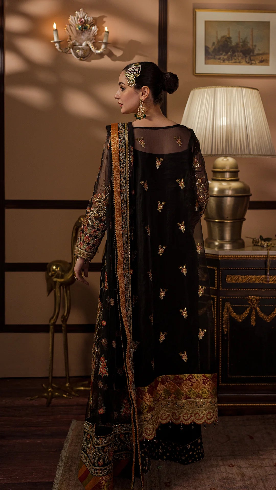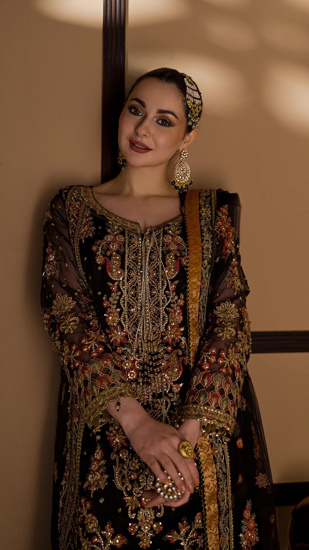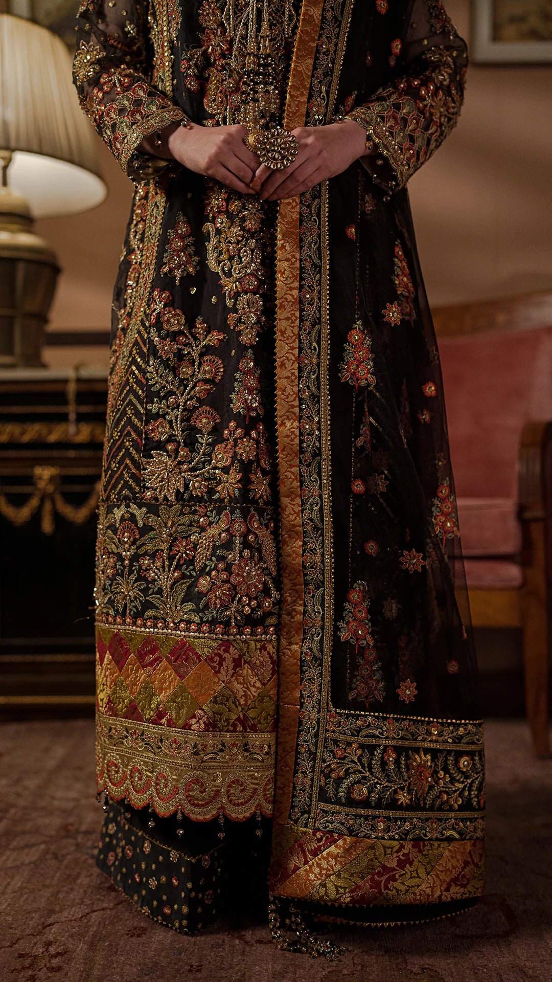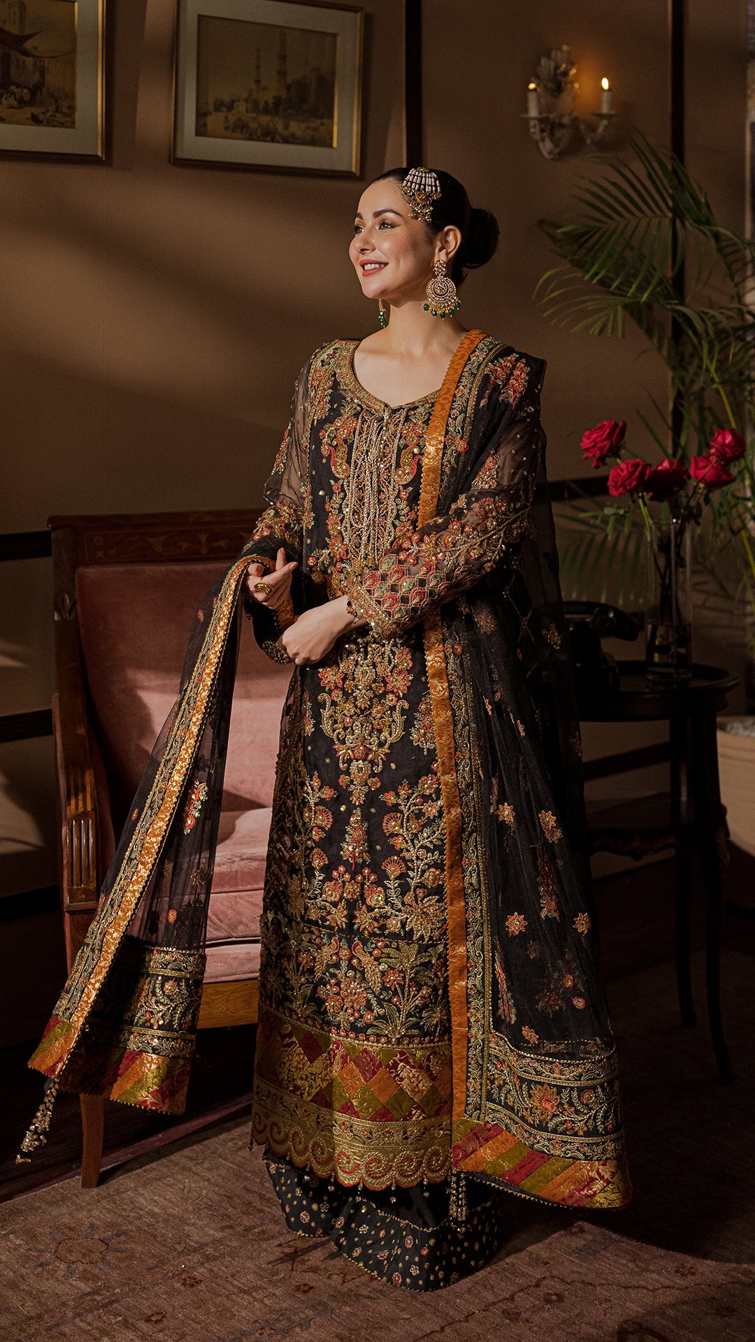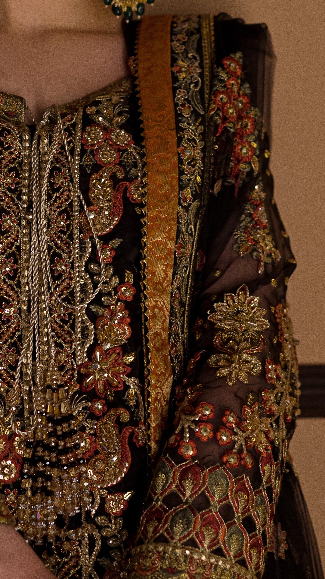 Oozing with old world charm, this refined black and gold masterpiece by AMMARA KHAN is the definition of timeless glamour. A heavily hand embellished center panel with rich side panels and an impeccable ghera that narrates a tale of love songs and romanticism in a wild garden. The sleeves are fully embroidered intricately to create a chatta-patti effect. The dupatta is covered with delicate all over embroidery, with meticulously crafted borders all sides. Delicate floral embroidery is added to finish off the ezaar pajama in resham and gold sequins and tilla. The perfect jora for a regal aura, timeless and unique. Our heart lies in couture-like details, as always we bring you the most celebrated and inimitable designs staying true to the classic- contemporary DNA of our brand.