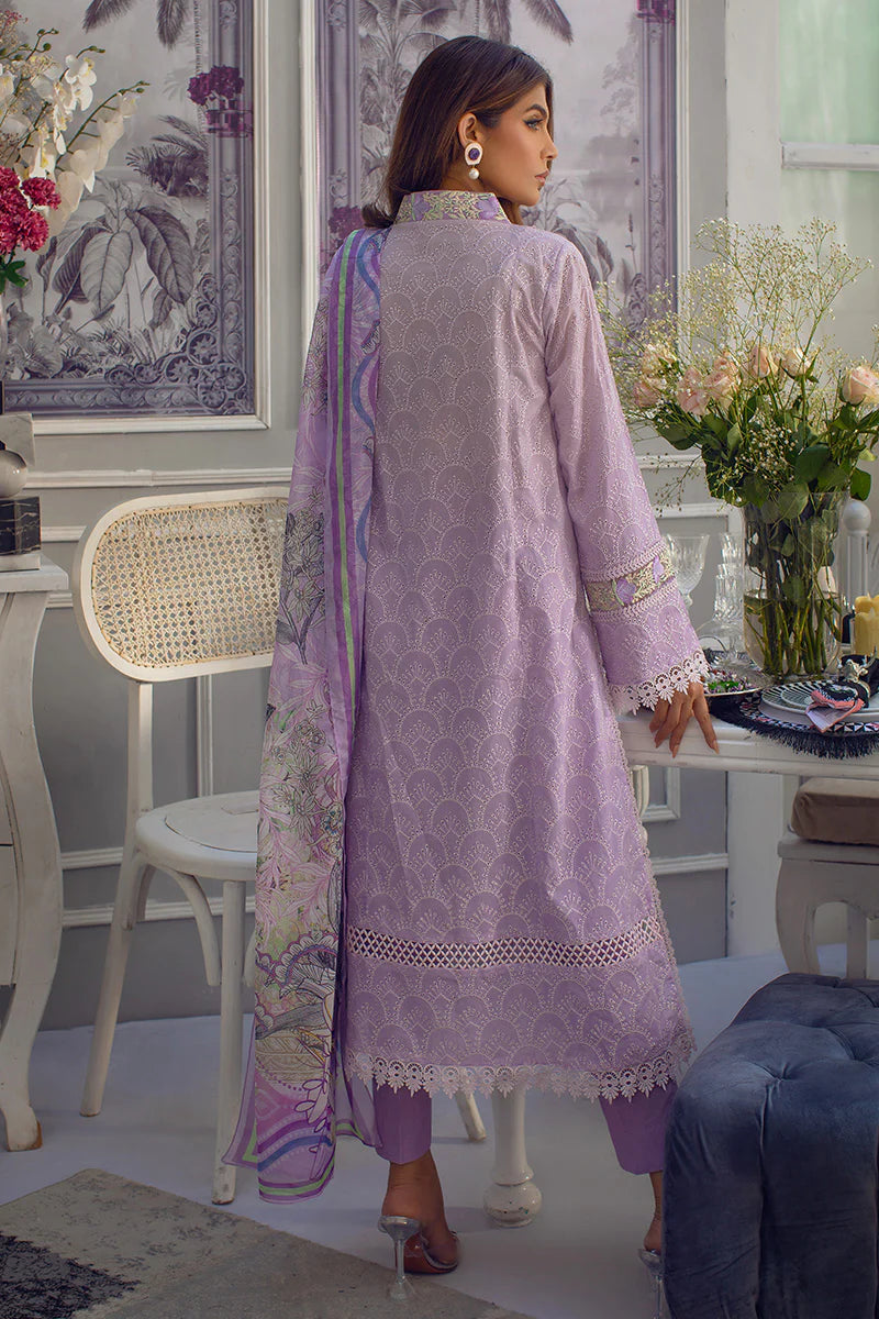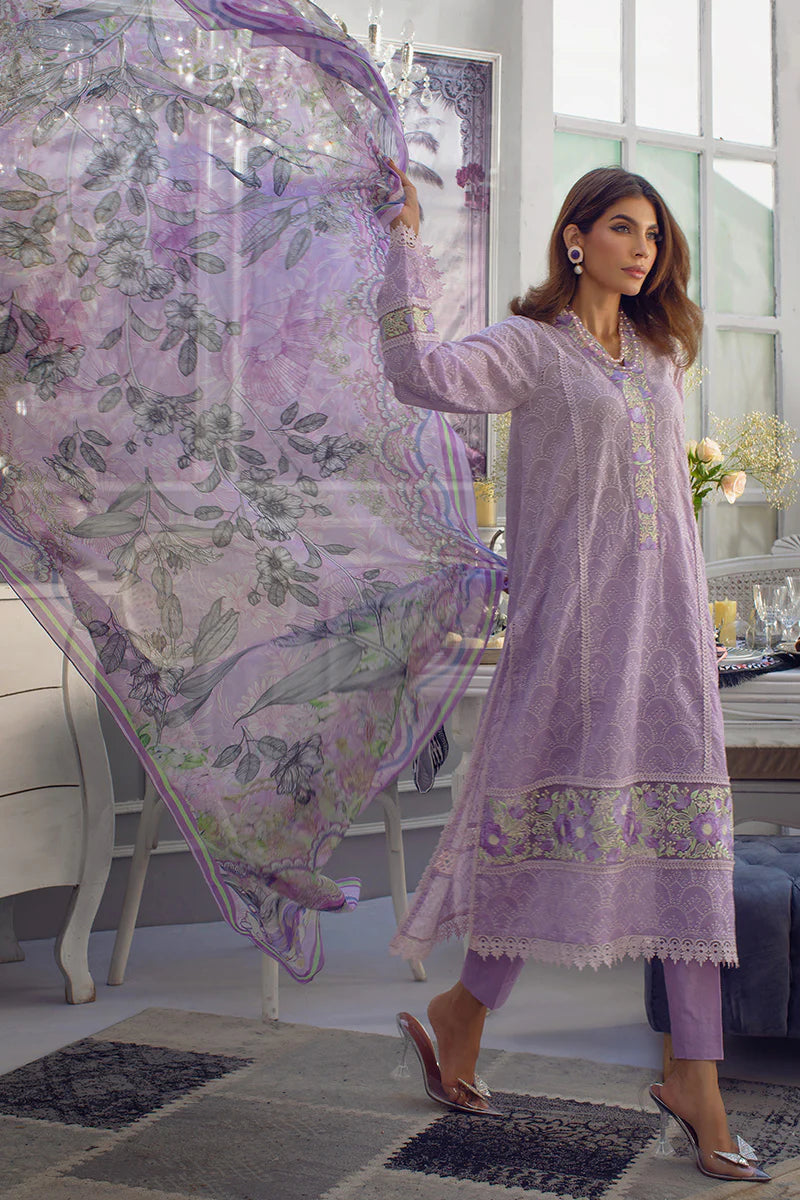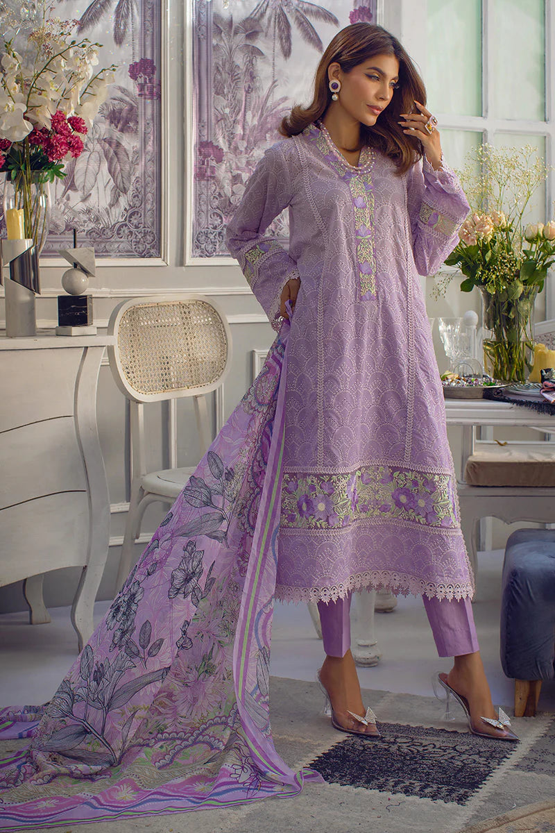 This stunning bespoke ensemble features a gradient of ethereal lilac hues, expertly crafted with the utmost attention to detail using the finest and most delicate laces in an A-line silhouette the ensemble is adorned with exquisite floral and botanical embroidery, meticulously rendered with a keen eye for intricacy and beauty. Each element of this ensemble speaks to the highest levels of artistry and craftsmanship. The ensemble is completed with digitally printed medium silk dupatta and solid dyed pants.