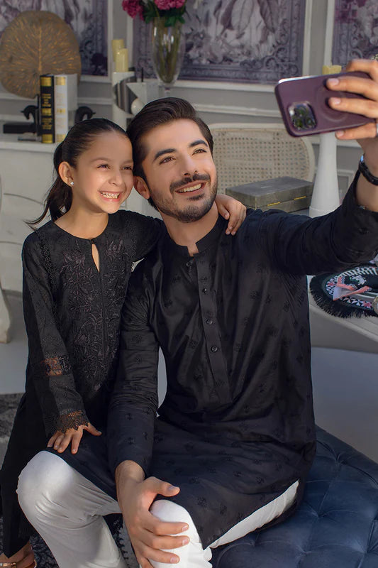 This classic black self on self shirt boasts an artistic a-line cut, a design element that creates a flattering and contemporary silhouette. The shirt is further elevated by the addition of intricate neck embroidery, adding a touch of luxurious detail and sophistication. This shirt is a true testament to timeless style and refined taste