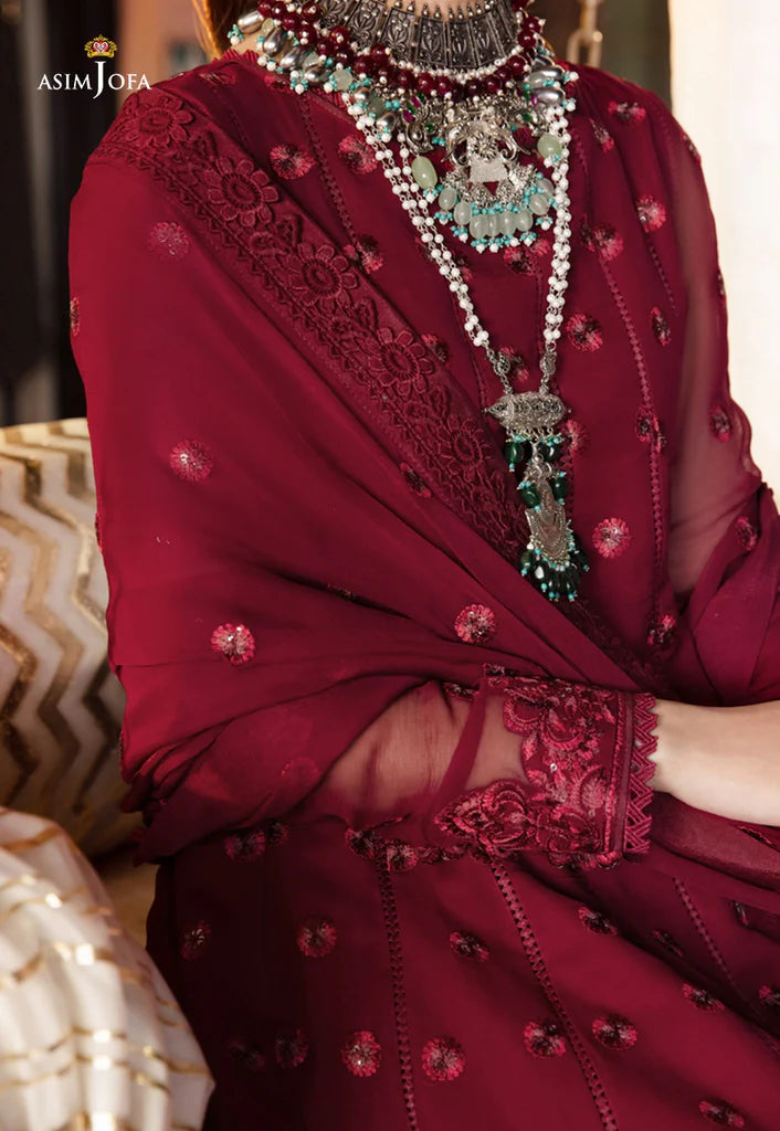 This beautiful kalidaar peshwas is etched with monotones of red thread work and sequins used for the sophisticated look.The flare is heavily laden with thread work. This gorgeous design comes with chiffon embroidered dupatta and dyed cotton pants.
