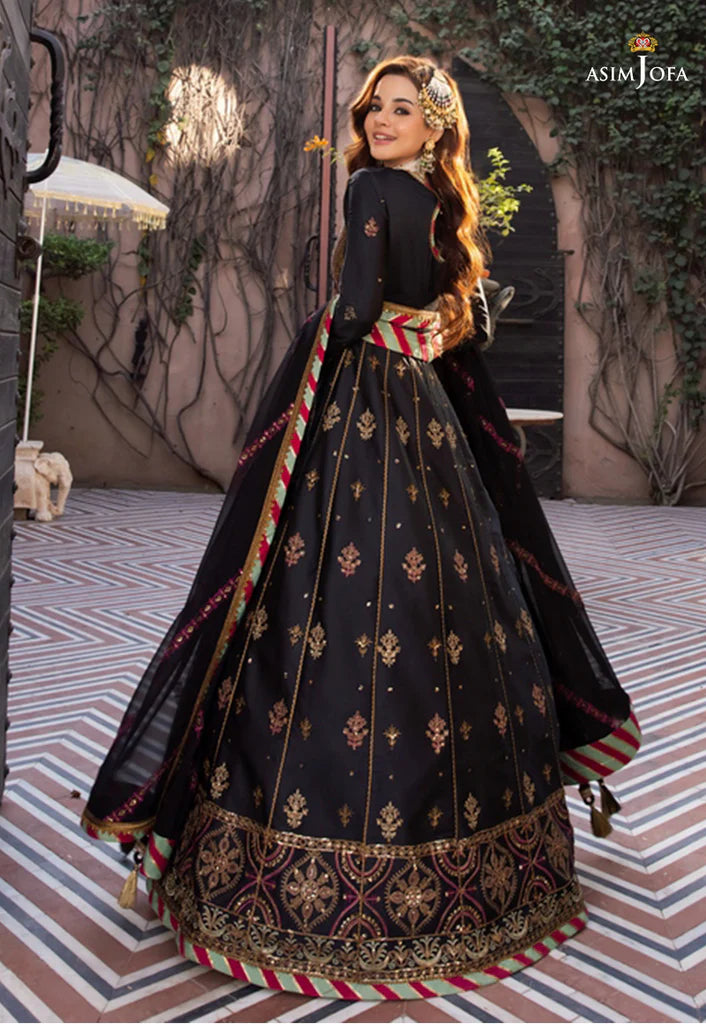 Komal Meer channels a princess donning this kalidaar peshwas made on lustrous black charmeuse silk with antique gold dori and zebra sequins worked beautifully on it. Magenta & sage green threads are used to add a pop of color. A broad embroidered border runs along the hemline. The bodice is done with geometric motifs embroidered on it. The peshwas is complemented with an embroidered chiffon dupatta with diagonal lines all over it and dyed silk pants.