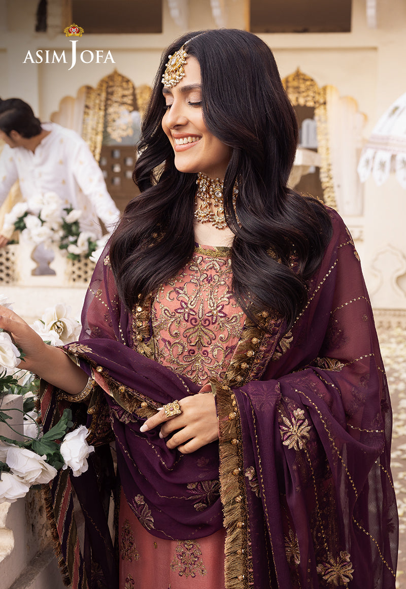 Discover serenity in the elegance of salmon hues with our traditional ensemble from ‘Shehnai Collection’. The embroidered ensemble including neckline and armholes patches are a canvas of exquisite zariwork and twin sequins exuding ethnic allure. The embroidered sleeves with border and bunches along with the embroidered border for daman and chaak add a touch of grace. Paired with a deep purple dupatta featuring four side borders, this outfit is a harmonious blend of tradition and sophistication.