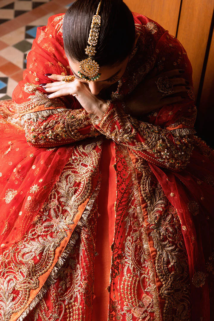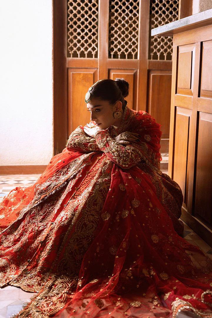 A majestic red colour attire made with intricate embroidery and gotta work adorned with emerald green stones and crystal work followed by diverse sequins giving it all royal feels.