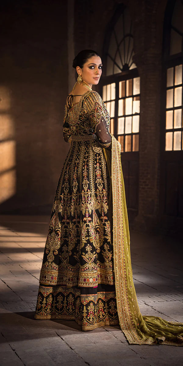 A symphony of elegance and vibrancy. This opulently embellished crinkle chiffon ebony tunic is adorned with vivid hues in intricate needlework. Paired harmoniously with a raw silk palazzo and a delicately textured chiffon dupatta featuring ornate embroidery along its perimeter, this ensemble exudes a captivating blend of sophistication and lively charm.