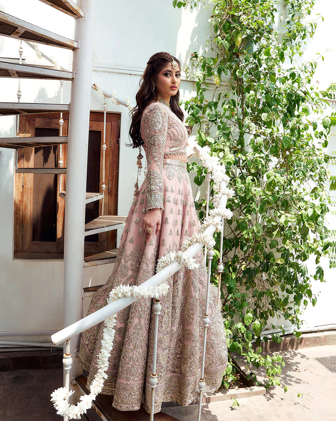 Naiza showcases the elite crafts of tilla embroidery artfully fused with sequins on a regal lehnga and choli silhouette. Crafted to perfection in FS signature aesthetic, the ensemble is impeccably hand embroidered by the finest artisans, while the ornate dupatta lends a delicate, feminine flair to the outfit. The soft, powder pink hue adds a true touch of royalty.