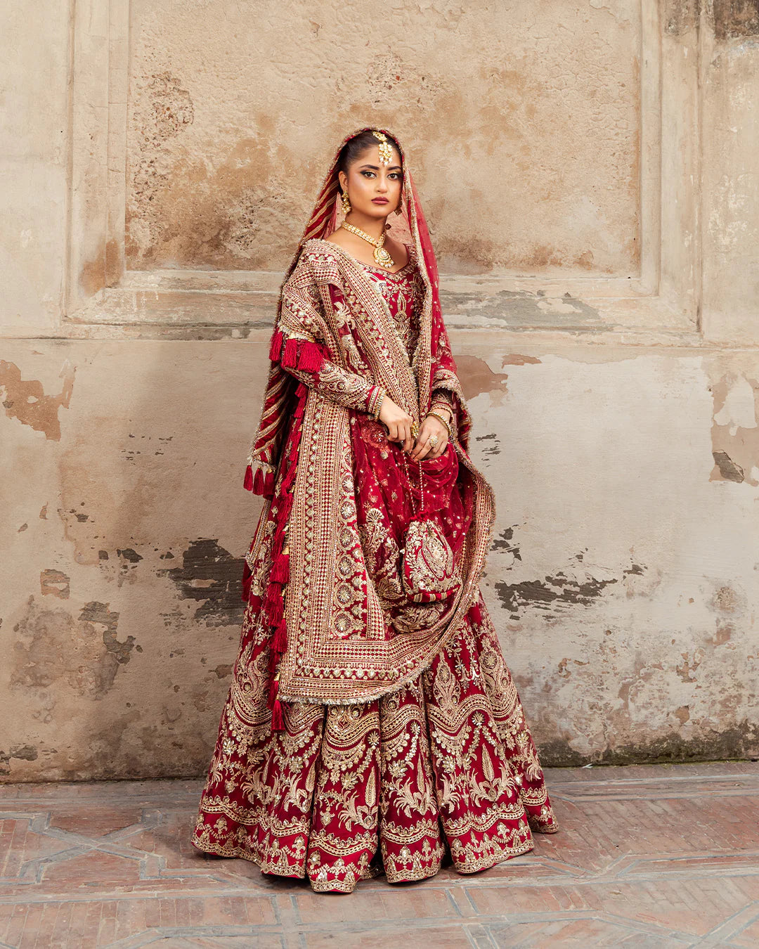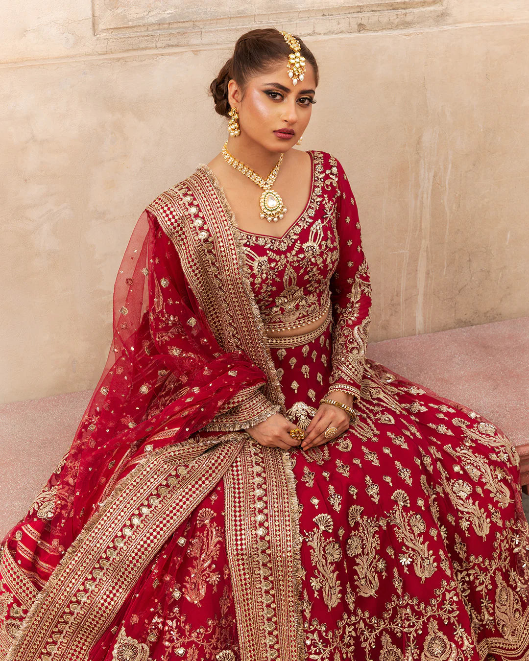 Zofia harnesses traditional craftsmanship in the iconic lehnga choli silhouette in a bold red hue. Prepared in delicate net, the outfit invokes vintage elegance using intricate motifs of tilla, sequin and resham, harmonized seamlessly with an embroidered net dupatta, sealing the look with an everlasting charm.
