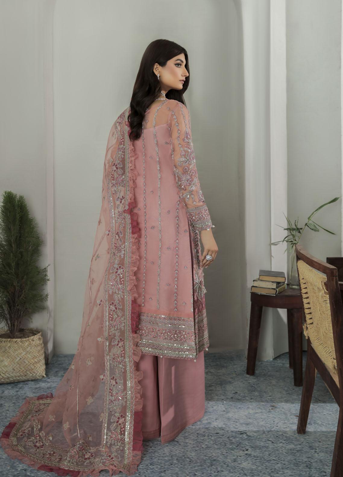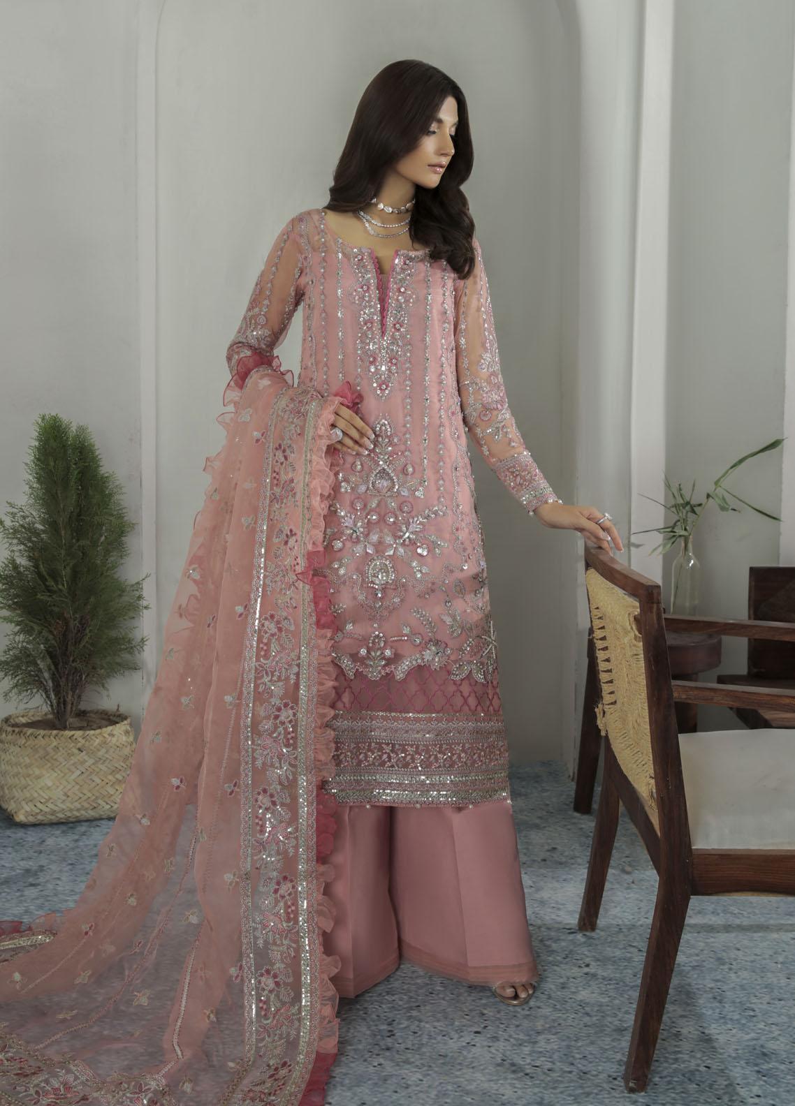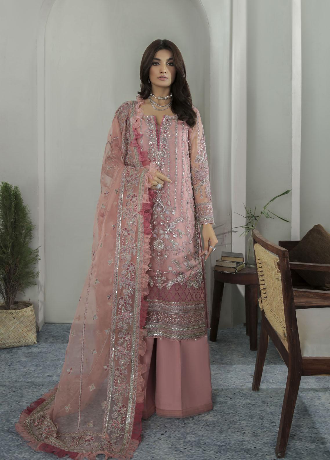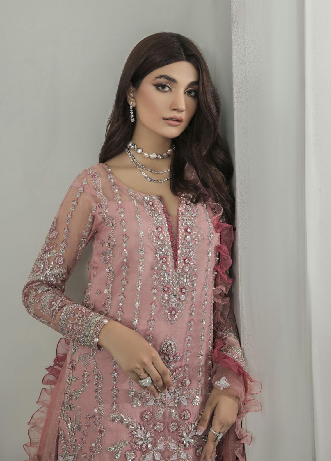 Aethira, item code GL-LP-22V1-01 from our made-on-order luxury pret collection, merges varying tones of pastel pink and tea pink into the same design. Rendered on a dyed organza base, the shirt is heavily hand-worked and embellished using our signature hand-worked techniques. Embellished to perfection, this outfit is detailed with a number of additional laces and accessories to complete the look. Definitely our favorite design from the entire collection