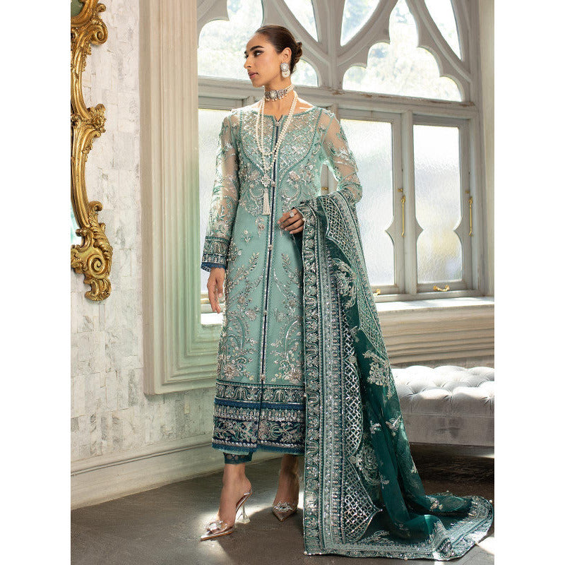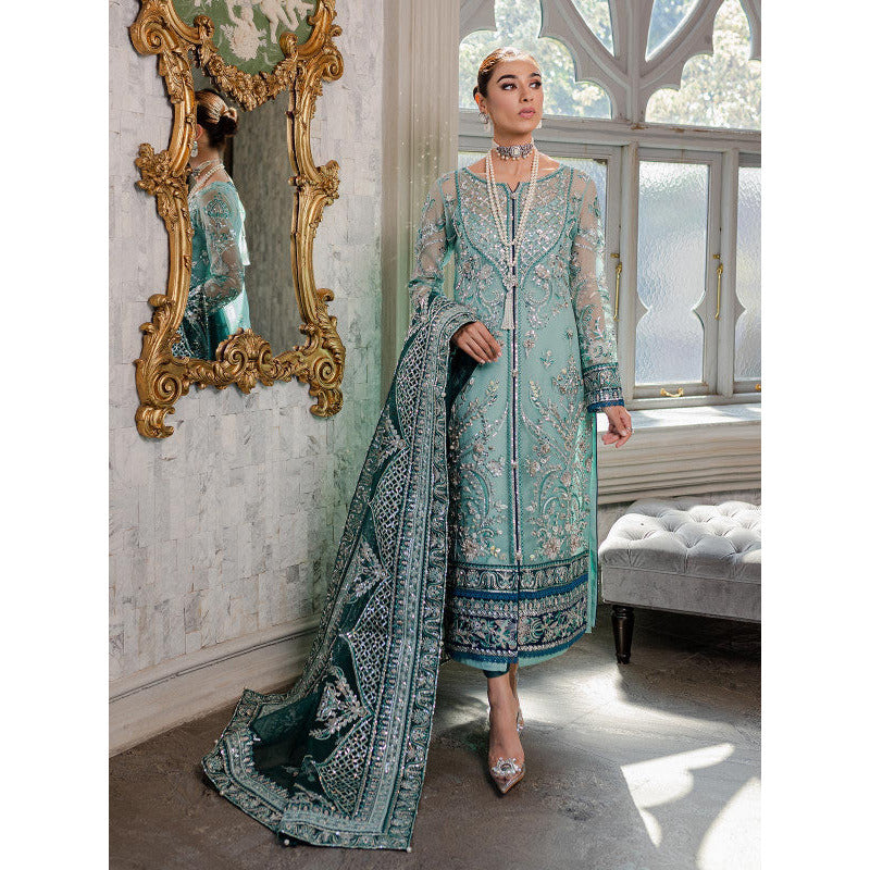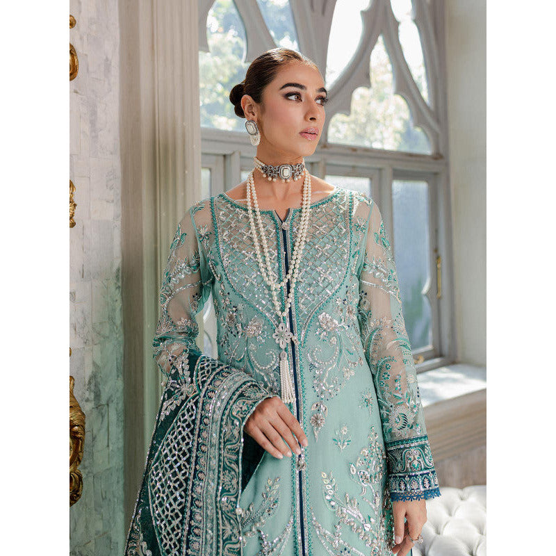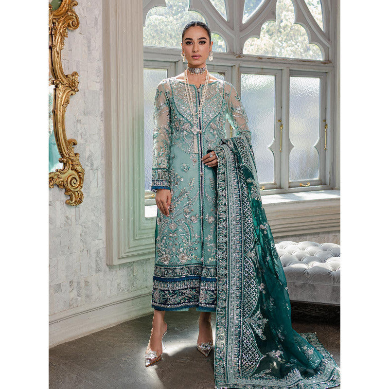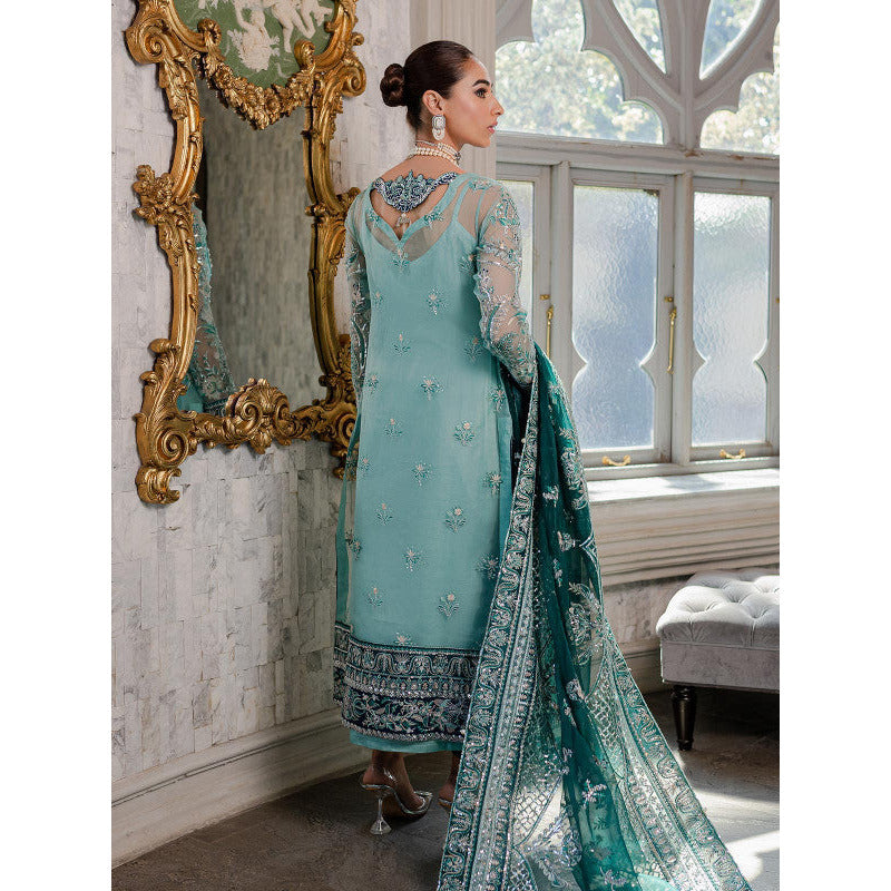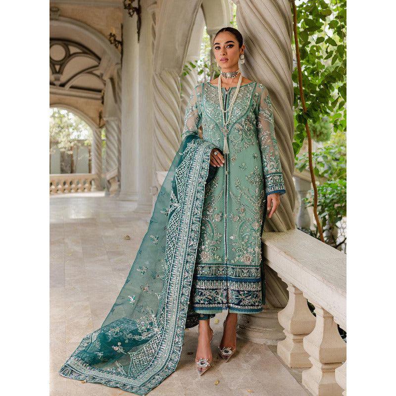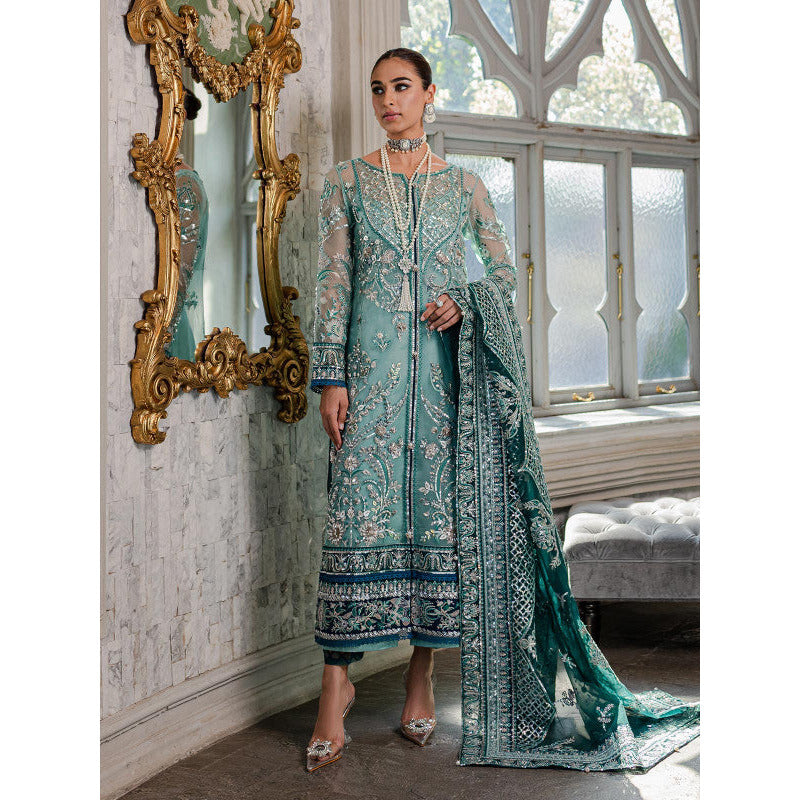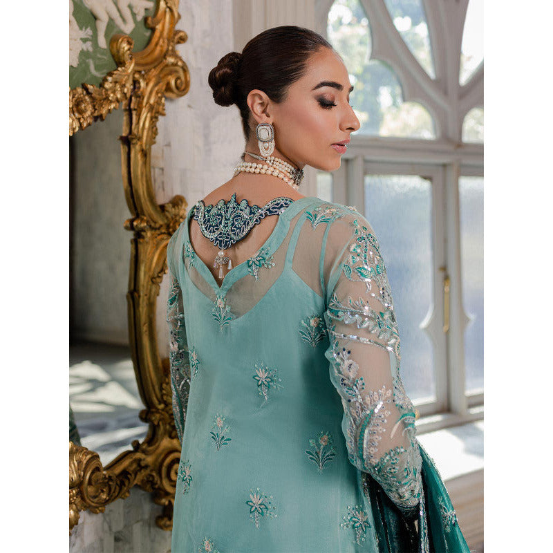 Milica, features a stunning combination of sea green with accents of dark emerald green and teal blue shades of organza. The outfit is exquisitely hand-worked for the upcoming wedding season. The dupatta is an absolute favourite of ours - heavily composed and majestically rendered stitch by stitch with intricate sequin detailing.