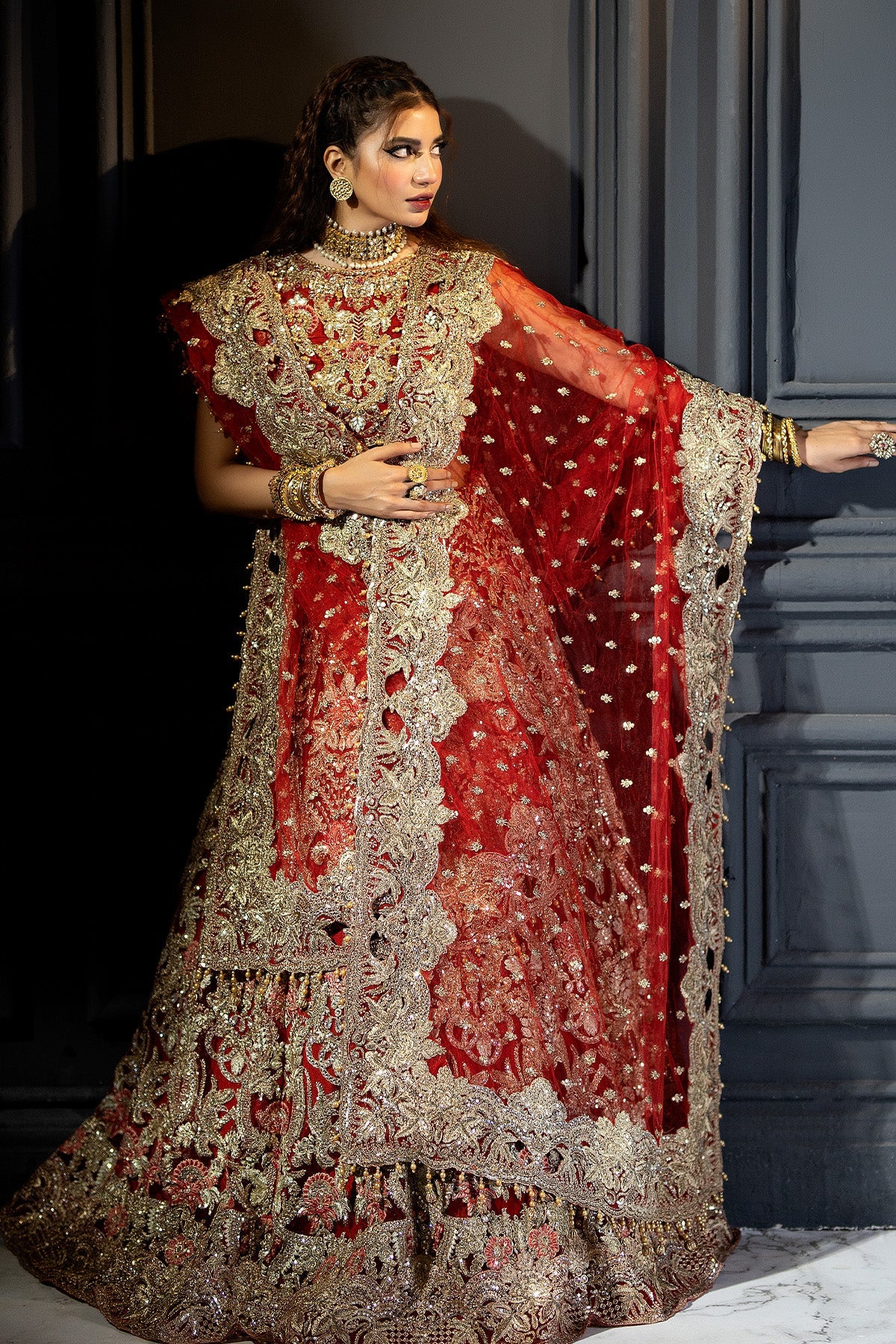 Embroidered net panels embellished with stone work.