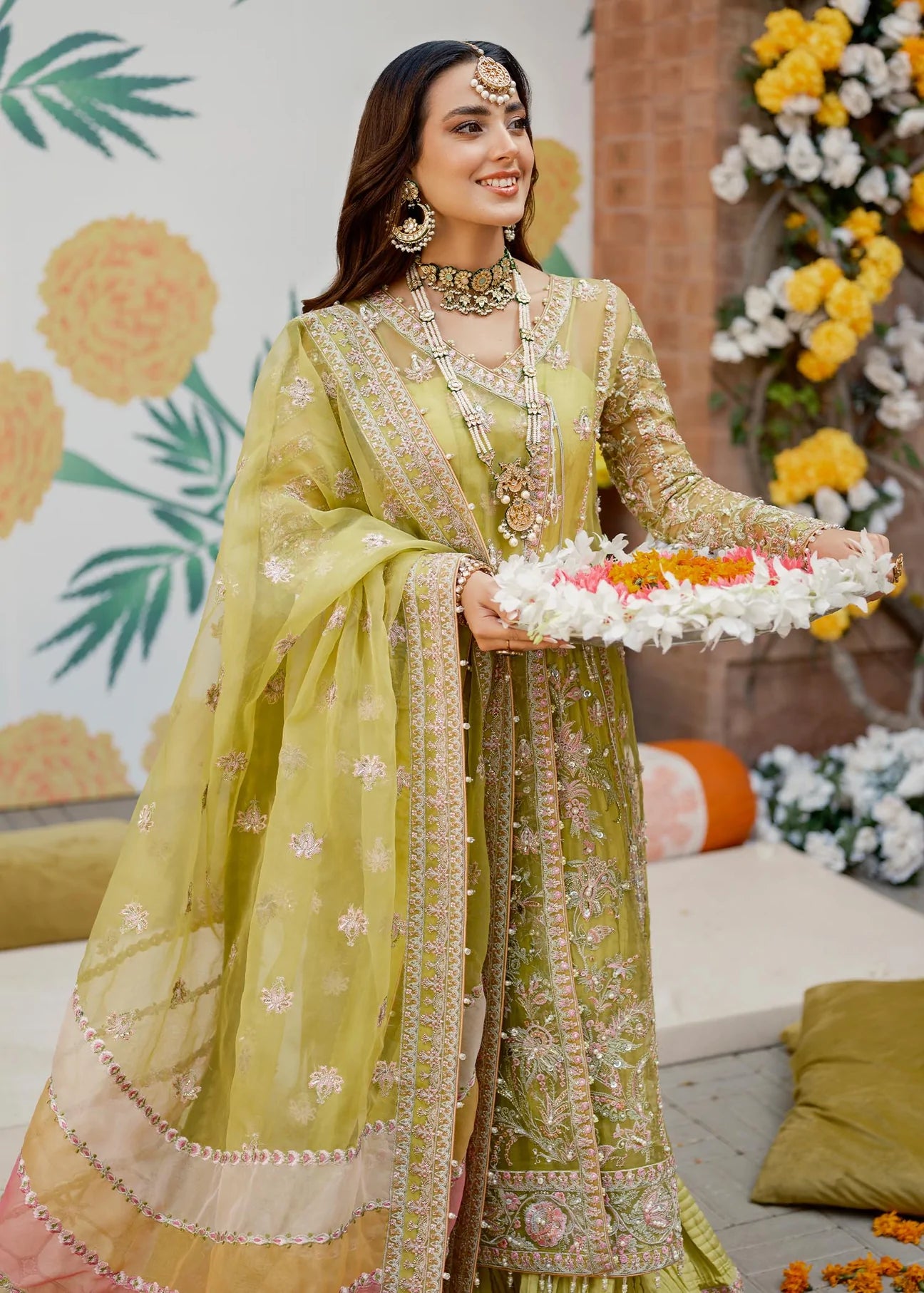 Vibrantly joyful parrot fit is the bold angrakha canvas design that instantly commands attention. Beautiful colors, flashing panni and hand embellished textures come together in this striking master piece. Paired with detailed laser work and embroidered traditional dupatta completing the stunning outfit.