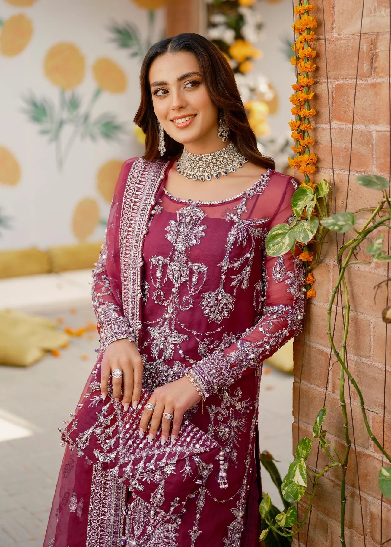 A deep cherry plum organza canvas is customary with ethnic elements laid in eye-catching silver sequin. Accompanied by an array of exquisite border. Paired with a diaphanous, fully embroidered organza dupatta and embroidered pants. This mesmerizing design is nothing short of being a show stopper.