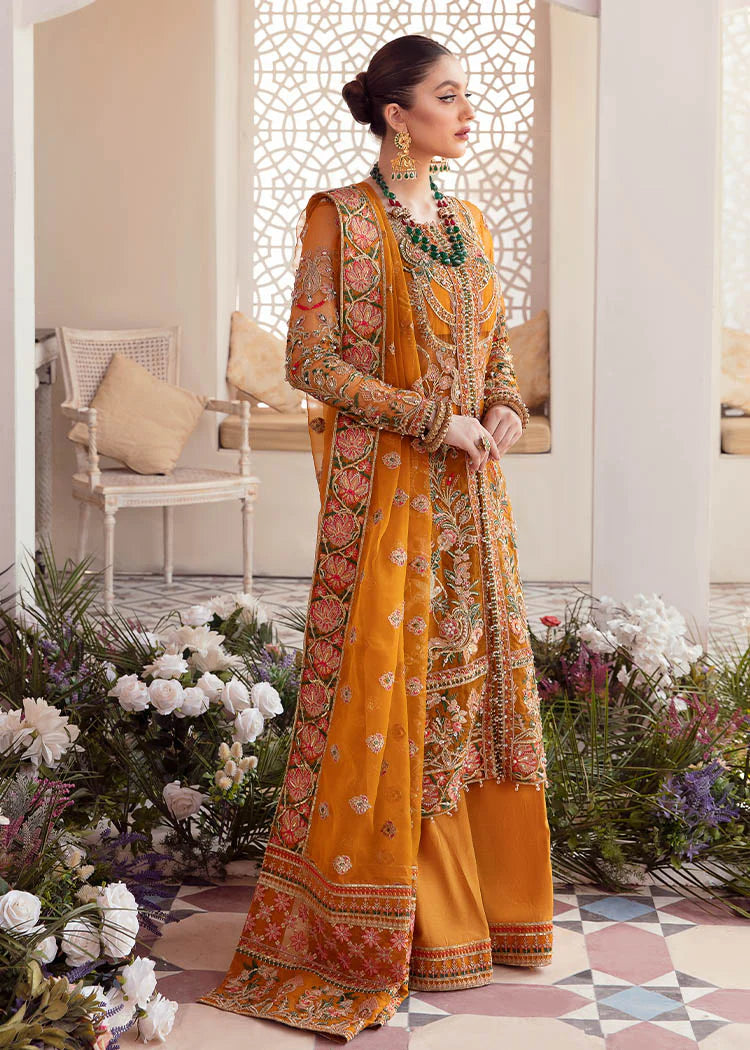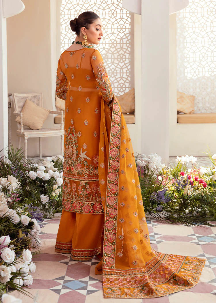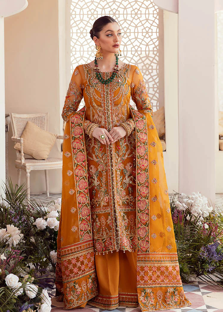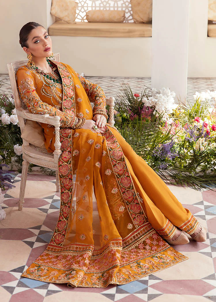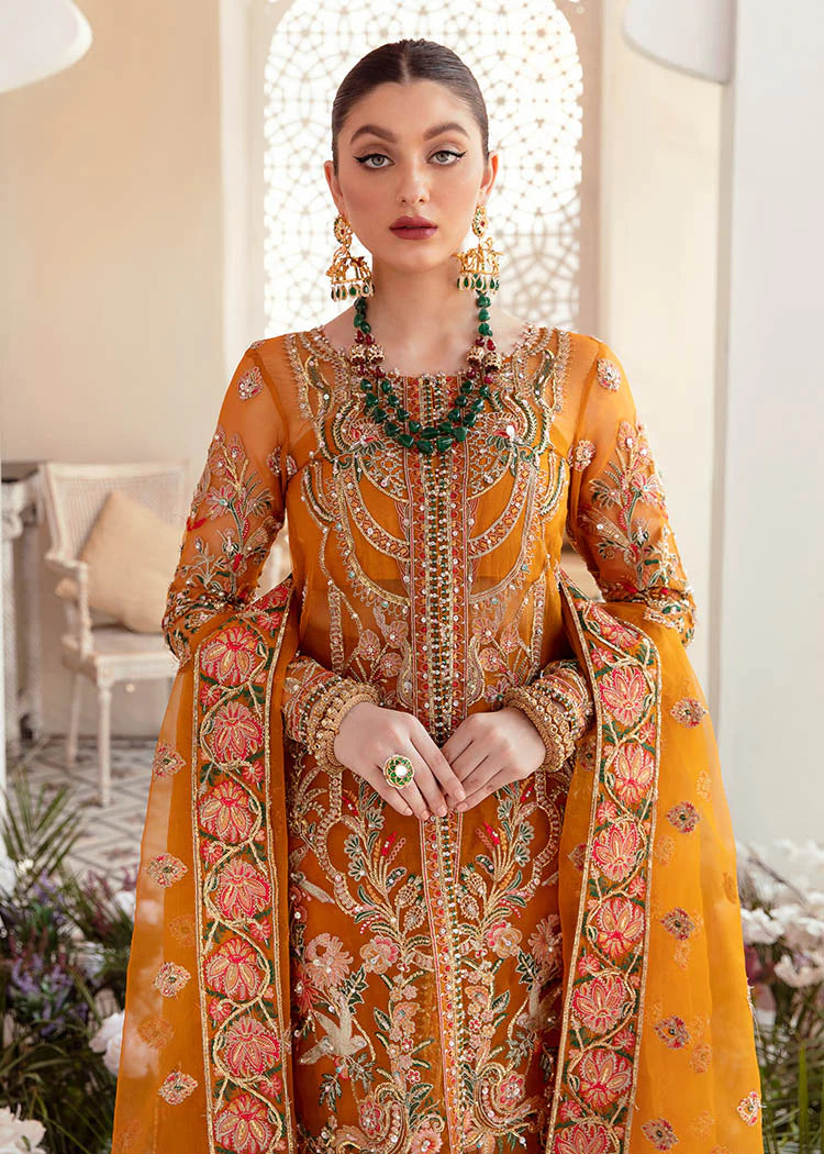 Giving an extravagant hint to your festivities, Kaira is designed in a glorious hue of rustic orange, embroidered delicately with crystal, pearls and sequin embellishments. The striking organza jacket is rendered in contrasting shades of green, red and orange with gleaming detailed tassels. It comes with a heavily embroidered dupatta, and azaar pants making this ensemble a perfect choice to any occasion.