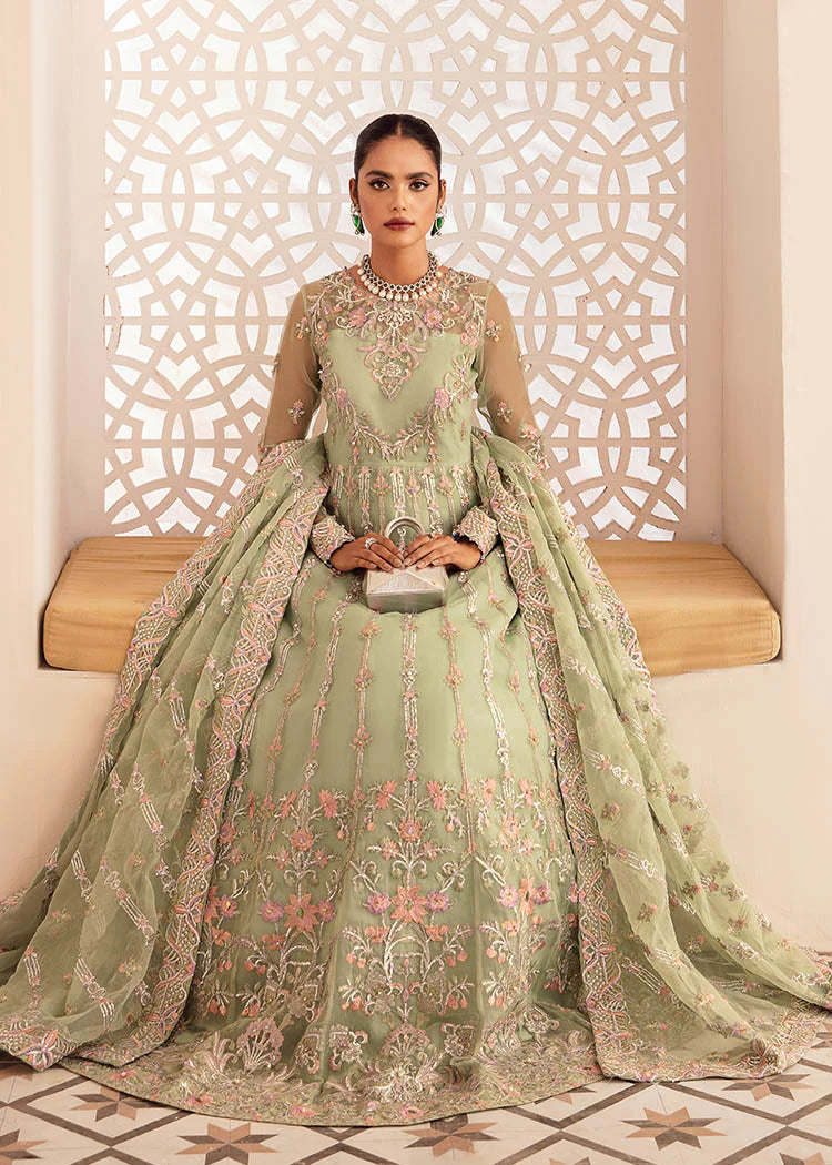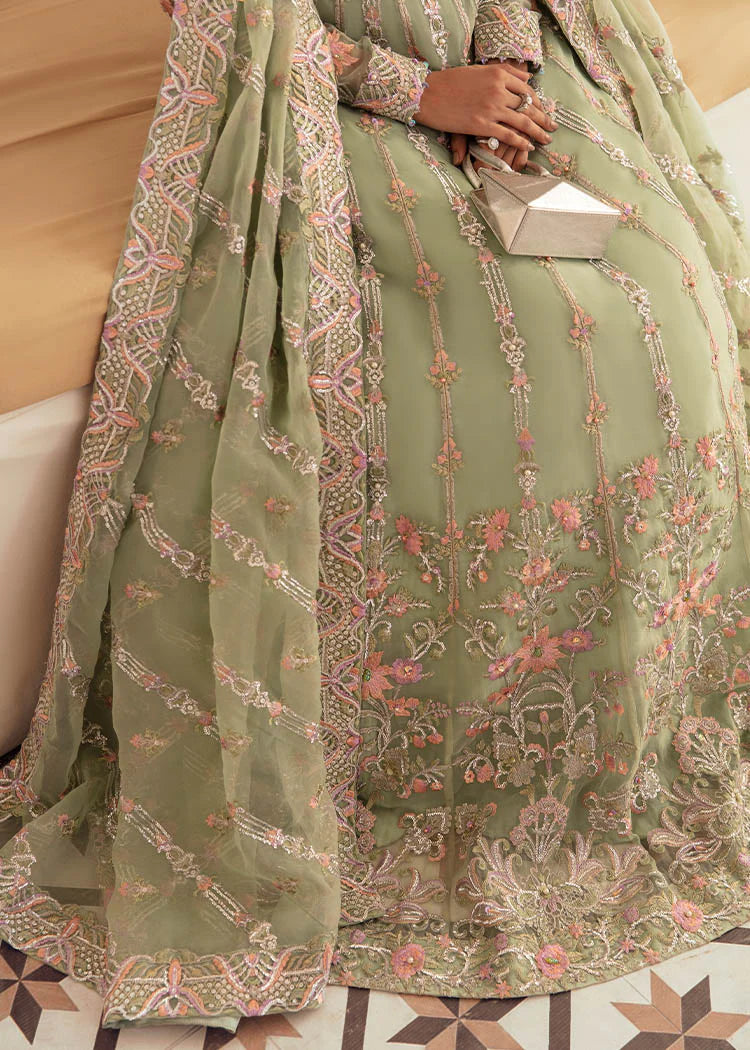 Izna is enchanted in a shade of rose pink, designed with elegance of pastel embroidery on an organza base. The beautiful monotone embroidered and detailed work over the neckline sleeves, front and back gives it a unique look for your wardrobe. Accompanied by an organza dupatta with heavy border embroidery and comfortably stylish cigarette pants with embroidery details at the hem. To finish off the final look, the outfit is carefully detailed with crystals and pearl hangings.