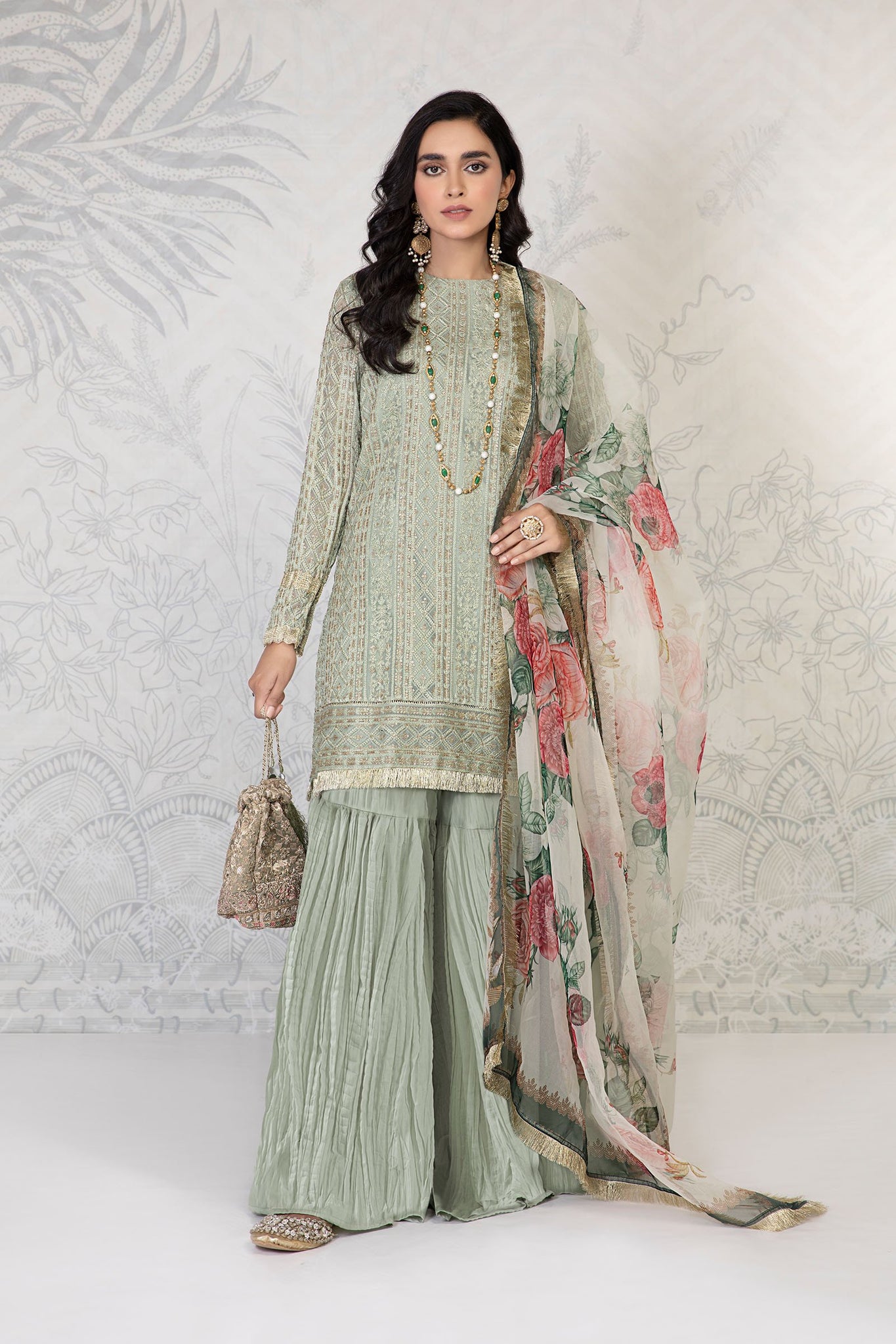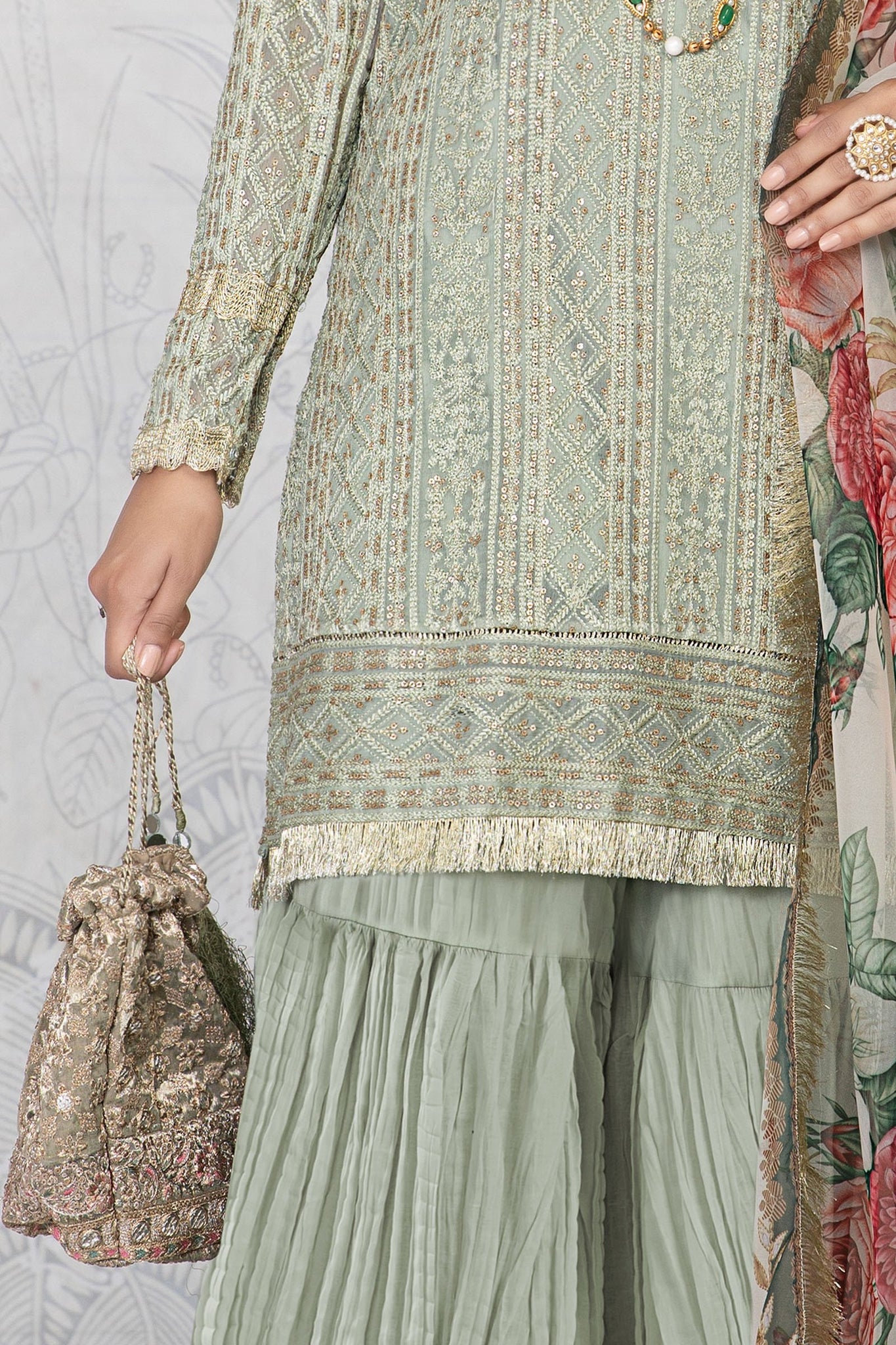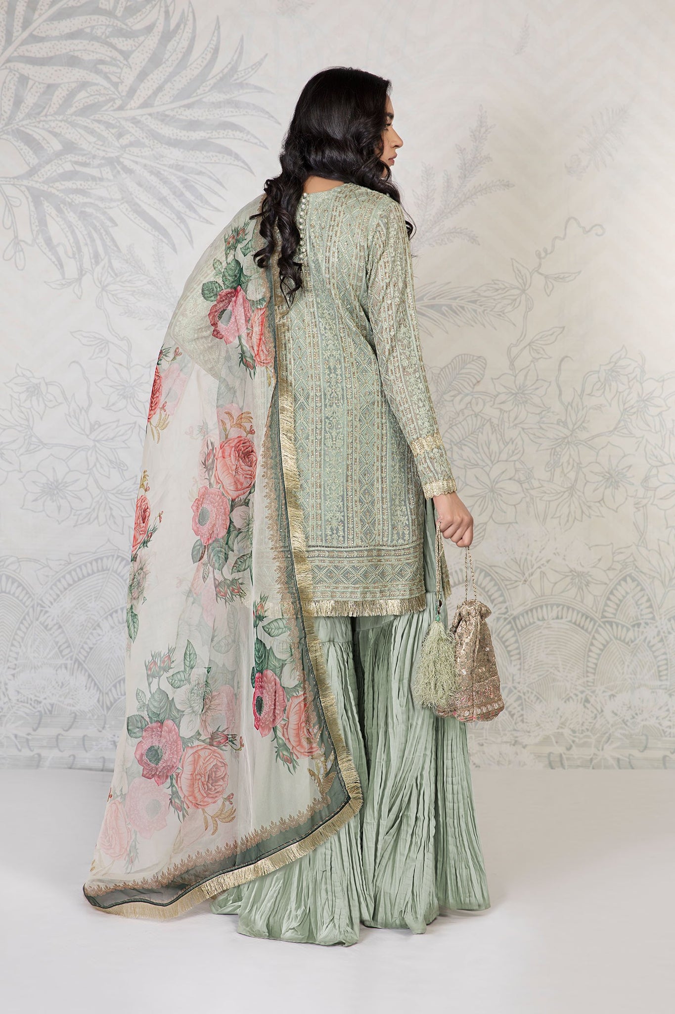 Straight shirt with chickenkari embroidery with thread and sequin on front ,back and sleeves. Tilla gold trims on sleeves and bottom. Button and loop details on back neckline paired with matching crushed gharara and digital printed dupatta with Kiran lace details
