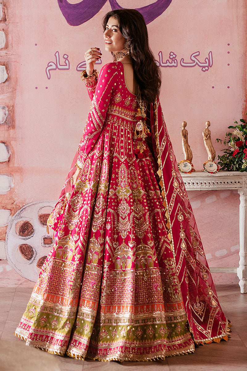 Musarrat Nazir is rich rose pink peshwas ensemble that redefines feminine grace. The ensemble is generously embroidered is generously embroidered all along the bodice and the skirt. The skirt panels/kalis feature floral vines juxtaposed with traditional Indian architectural details of domed chhatri along with decorative accents of jaali/lattice work, and trims along the hem of skirt in shades of dhani green, gulnari pink and peach orange. It is paired with a coordinating tonal dupatta generously embroidered in chevron pattern and accented with decorative motifs.
