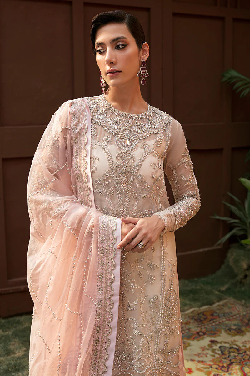 The ethereal beauty of off-white hued ensemble forms the foundation of this exceptional outfit Fiorella. Its soft and lustrous texture gracefully drapes, exuding an air of understated charm that is perfect for both daytime and evening events. Crafted in a captivating off-white hue, this hand-embellished ensemble features an exquisite array of kora, dabka, naqshi, sequins, pearls, and Swarovski crystals.