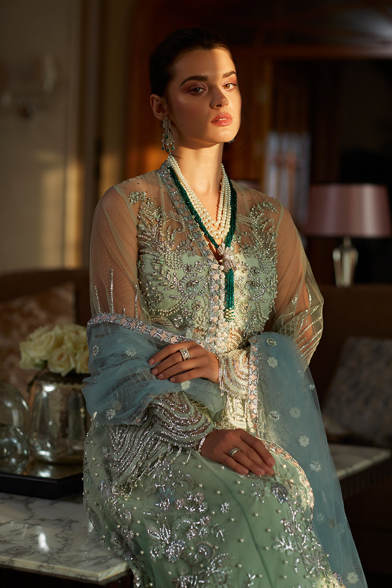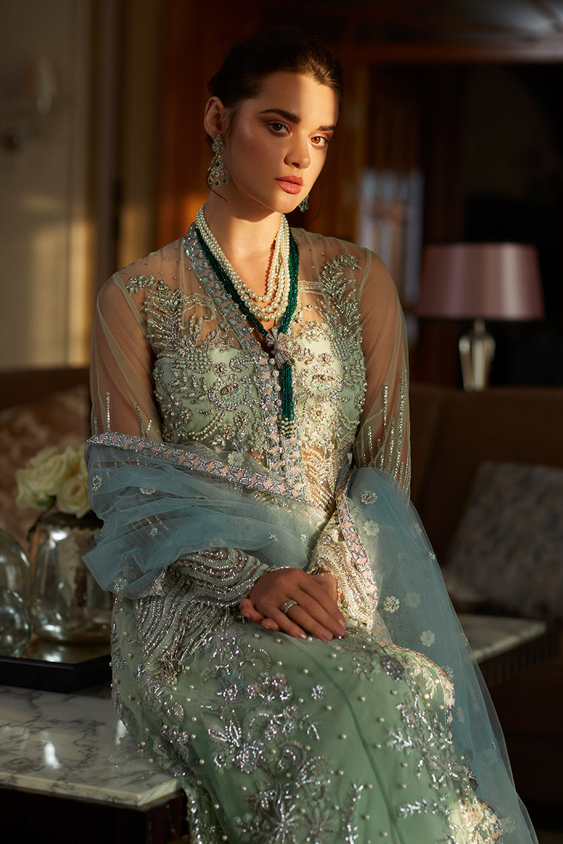 -Embroidered and sequinned sleeves (net Embroidered, sequinned and pearl embellished front and back daman border (organza)