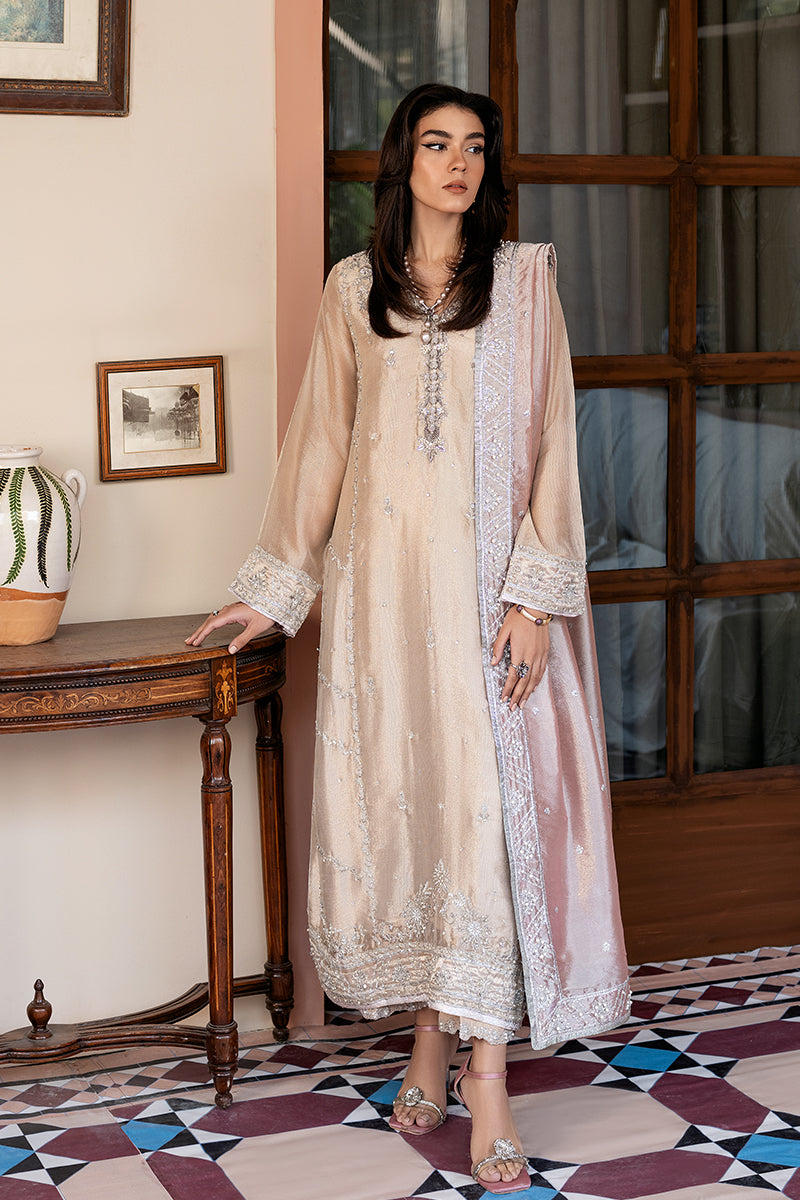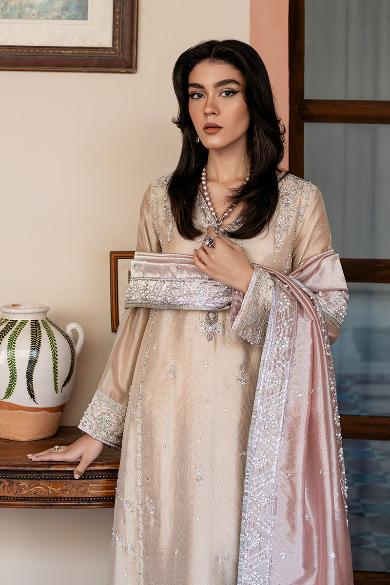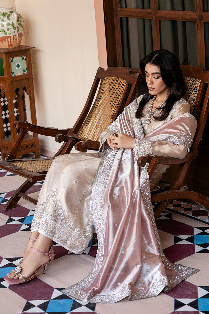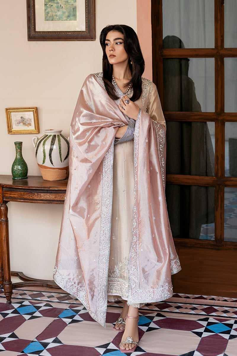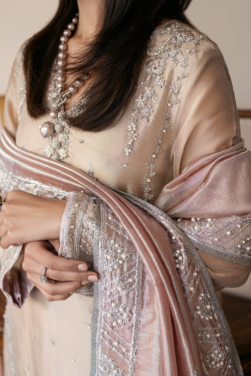 LEILA is crafted from pure almond zari net encrusted with delicate hand embellishments to create a classy and elegant ensemble. A pearl embellished pastel rose pink zari tissue dupatta completes the final look of this design.
