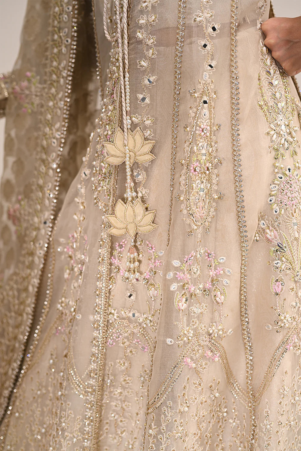 A soft beige dress adorned with intricate resham embroidery in beautiful hues, complemented by delicate hand embellishments and intricate shesha work. This ensemble effortlessly combines timeless elegance with artisanal charm.
