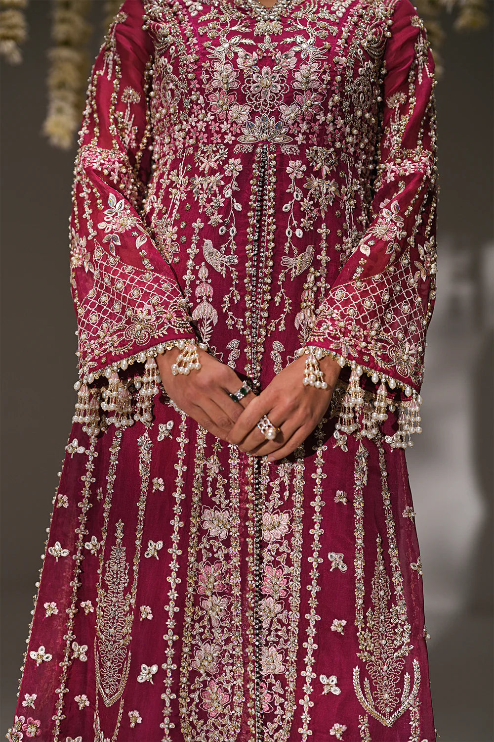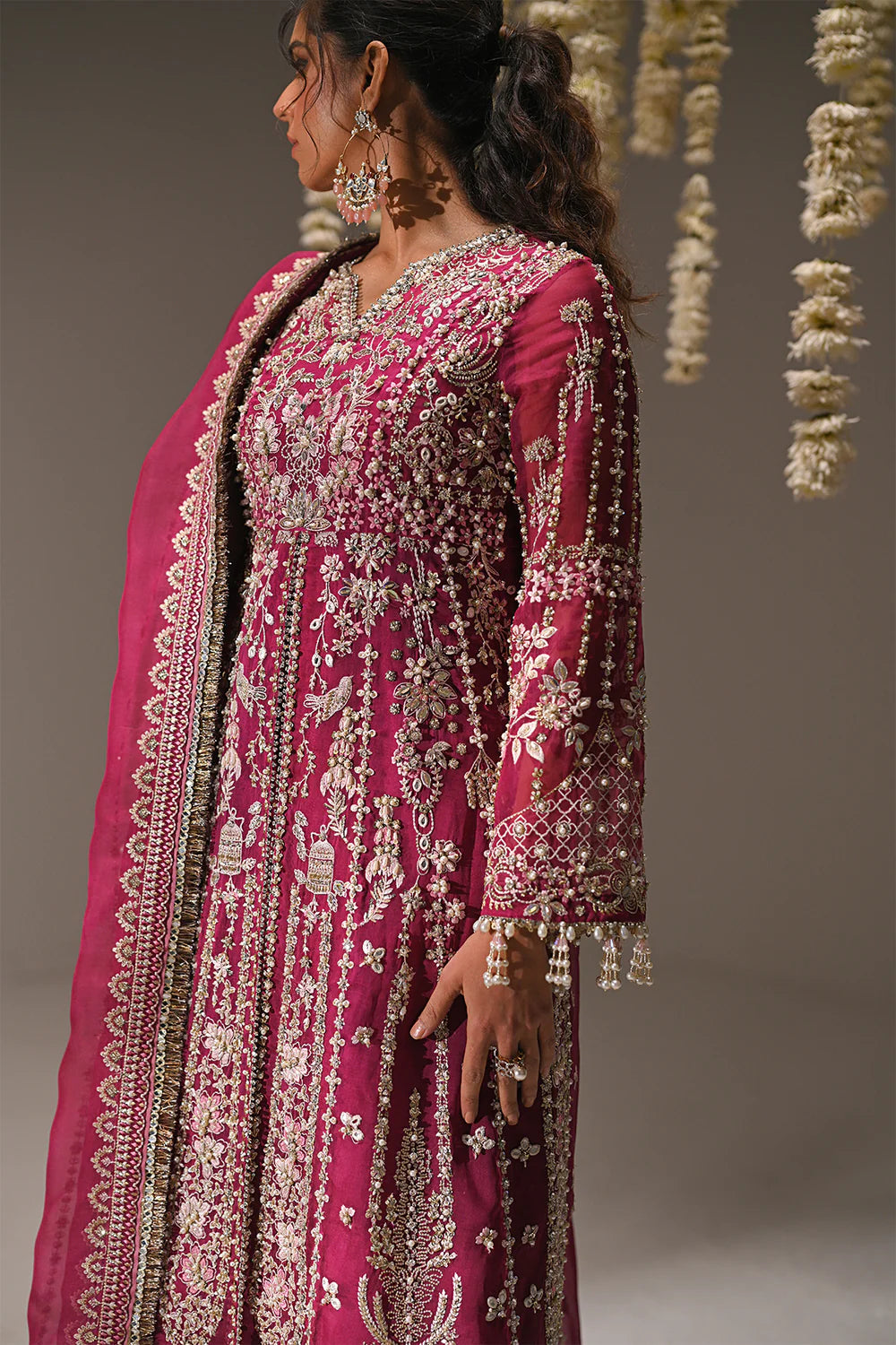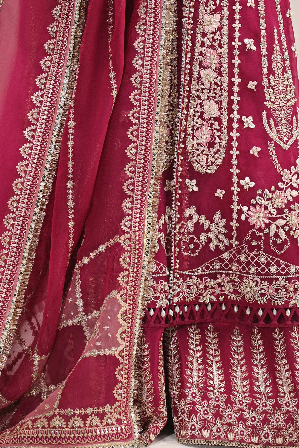 This stunning ensemble, designed in a rich deep magenta hue, is crafted on luxurious organza fabric, paired with raw silk azaar pants and an ethereal organza dupatta. The outfit features intricate embroidery complemented by exquisite hand embellishments, adding a timeless charm to its design. Perfect for festive occasions, it embodies elegance and grace in every detail.
