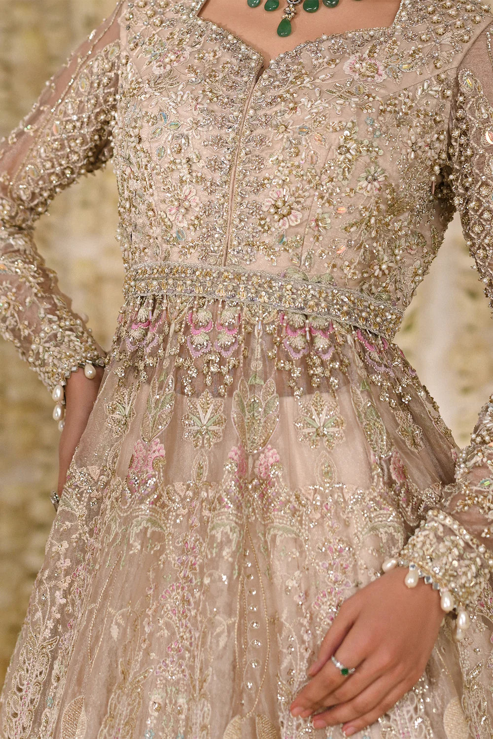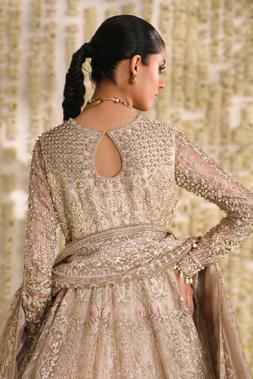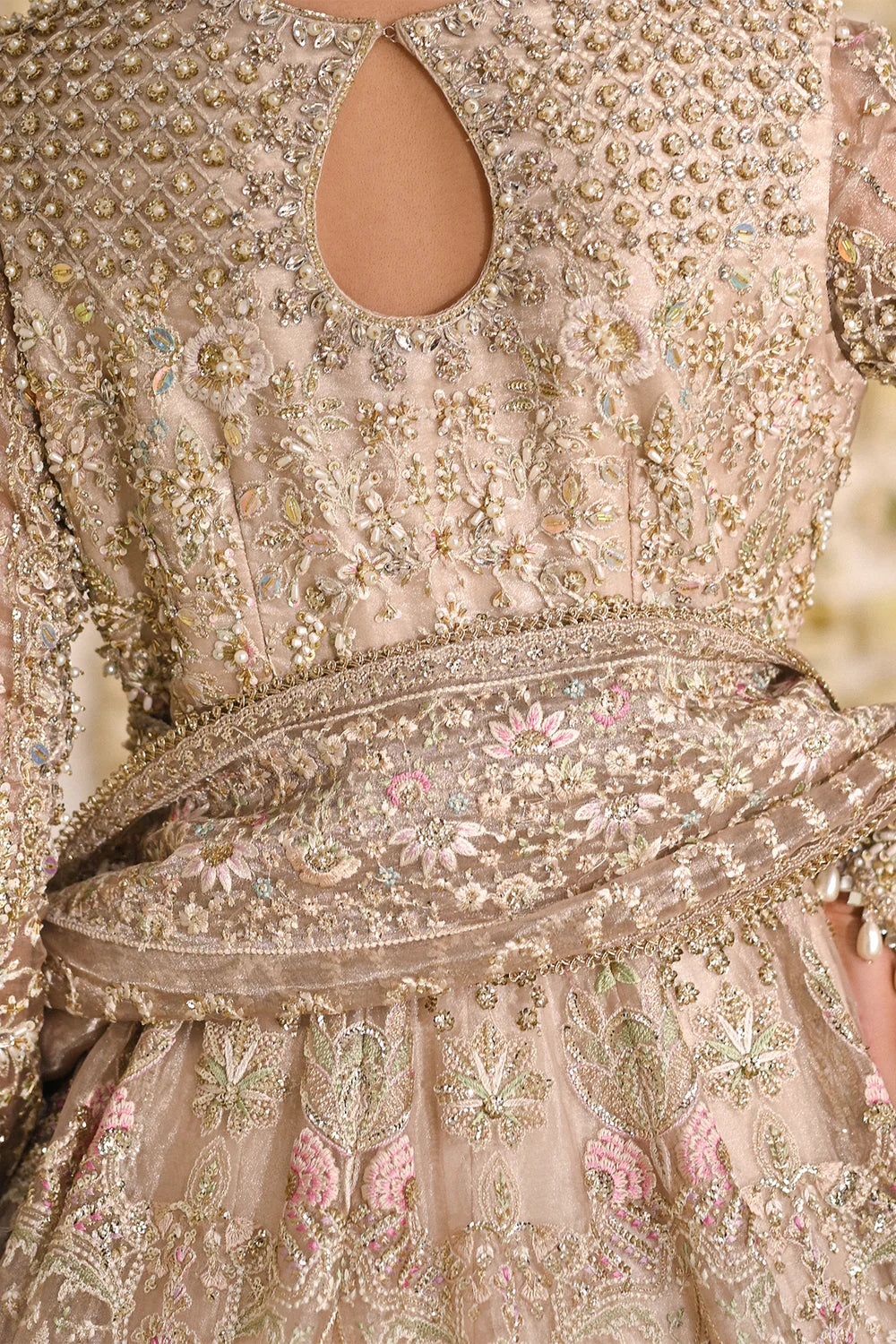Elevate your style with this exquisite, Chanderi Tissue Pishwas, a perfect blend of elegance and tradition. Adorned with intricate embroidery and delicate hand embellishments, Paired with a luxurious tissue dupatta and a flowing lehenga, it’s an ideal ensemble for your big day.