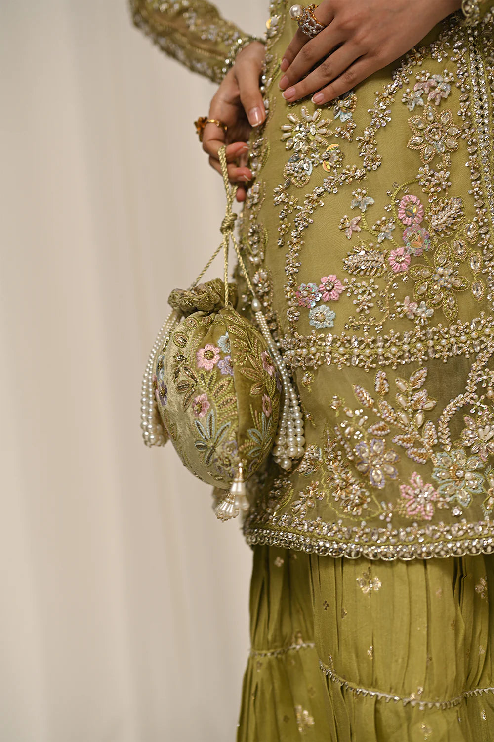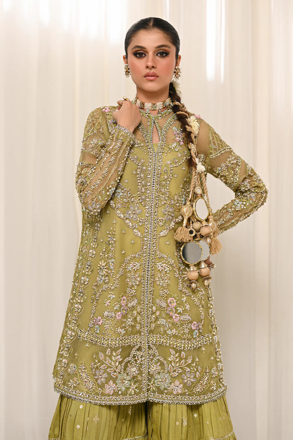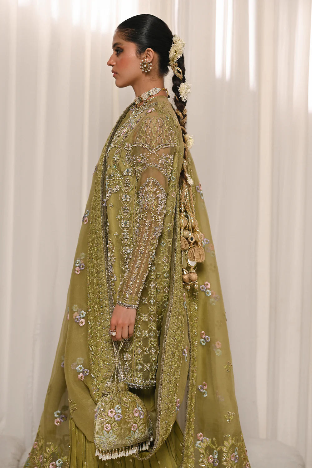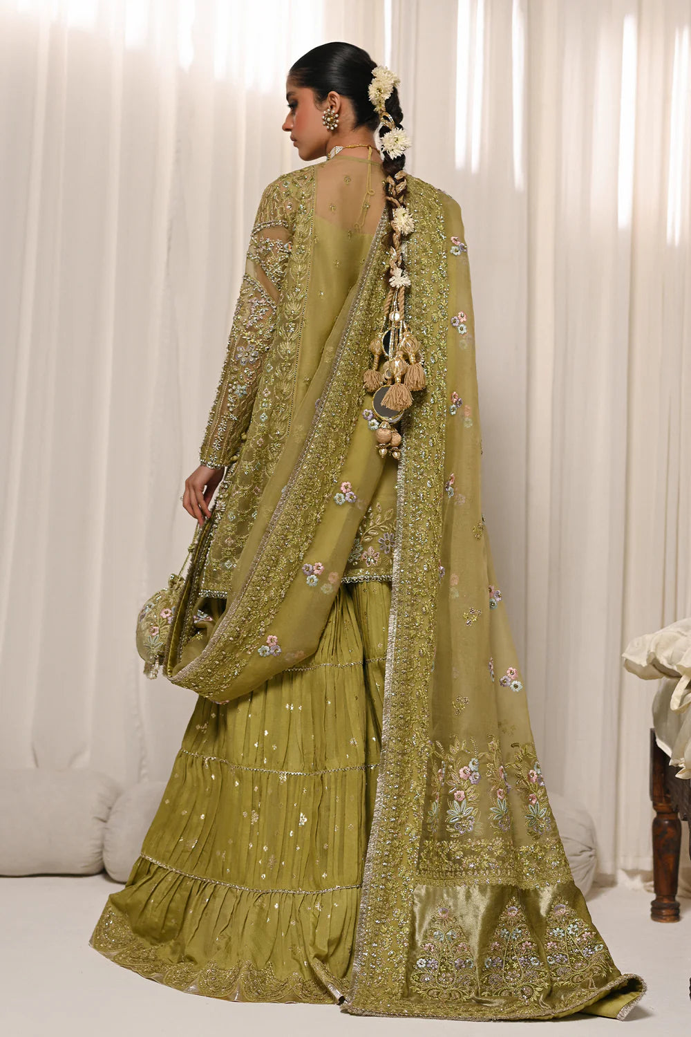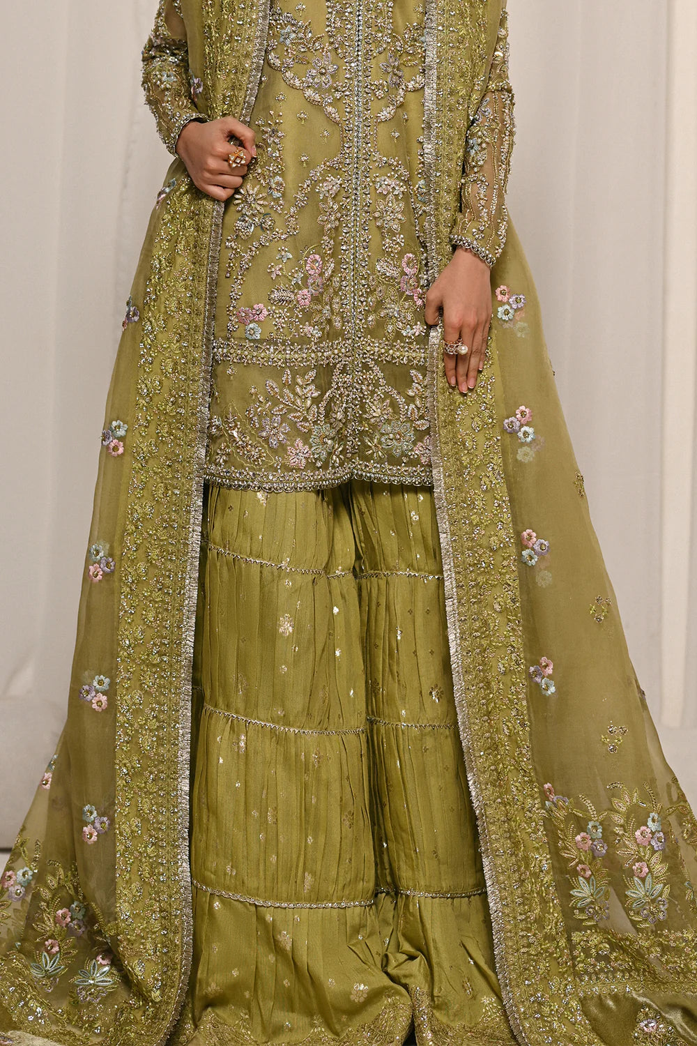 An exquisite olive green ensemble featuring intricate embroidery with delicate floral motifs. Paired with a flowing sharara and a traditional Hyderabadi khara dupatta, this outfit seamlessly blends timeless elegance with regal charm, perfect for festive or bridal occasions.