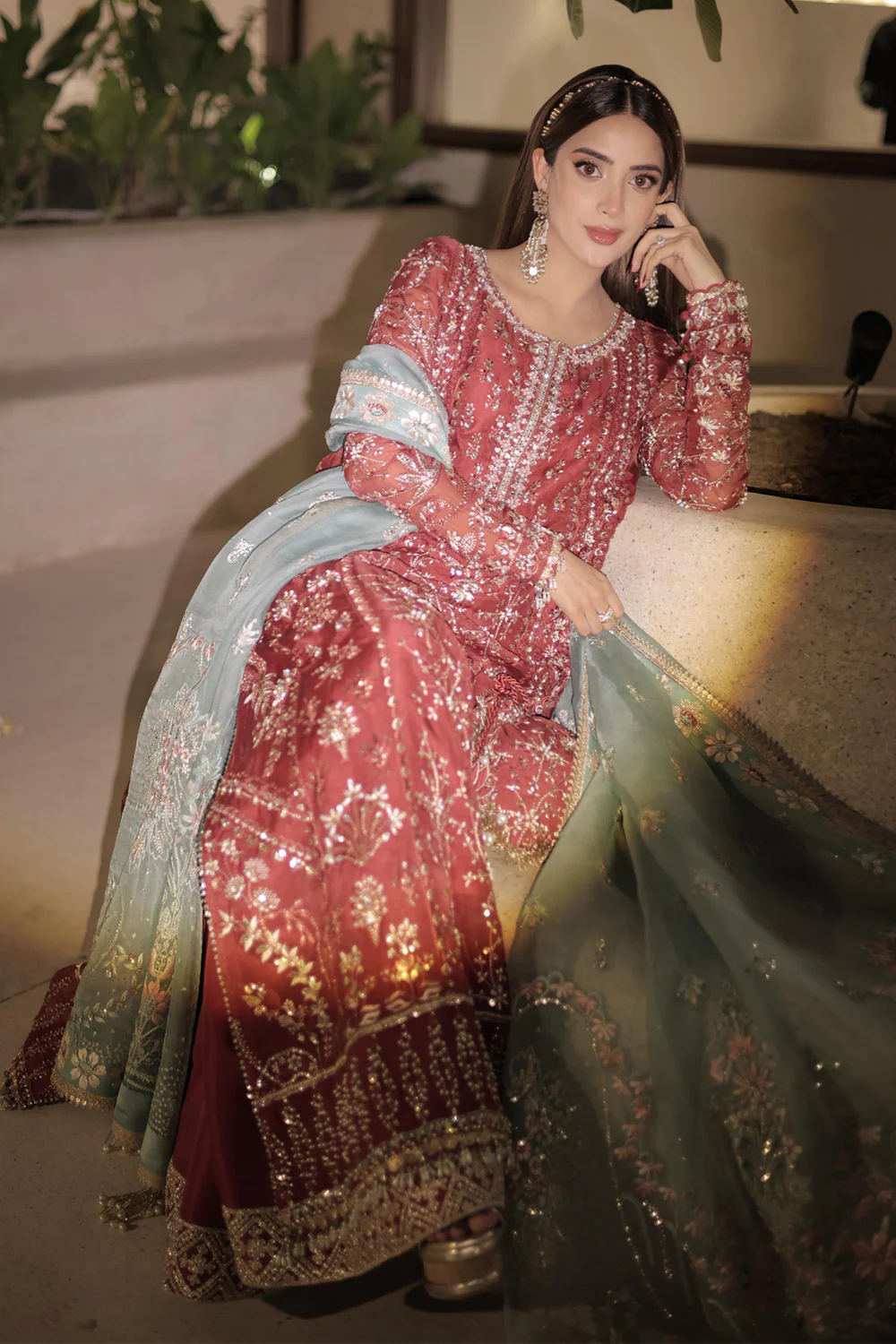 An exquisite rust organza kurta adorned with intricate resham and tilla embroidery, enhanced by delicate hand embellishments. Paired with classic azaar pants and a contrasting turquoise embroidered dupatta, this ensemble is a perfect blend of timeless tradition and modern elegance.