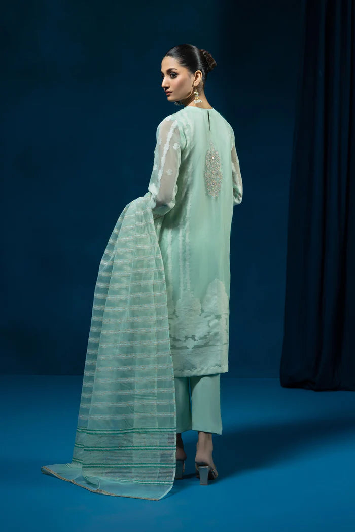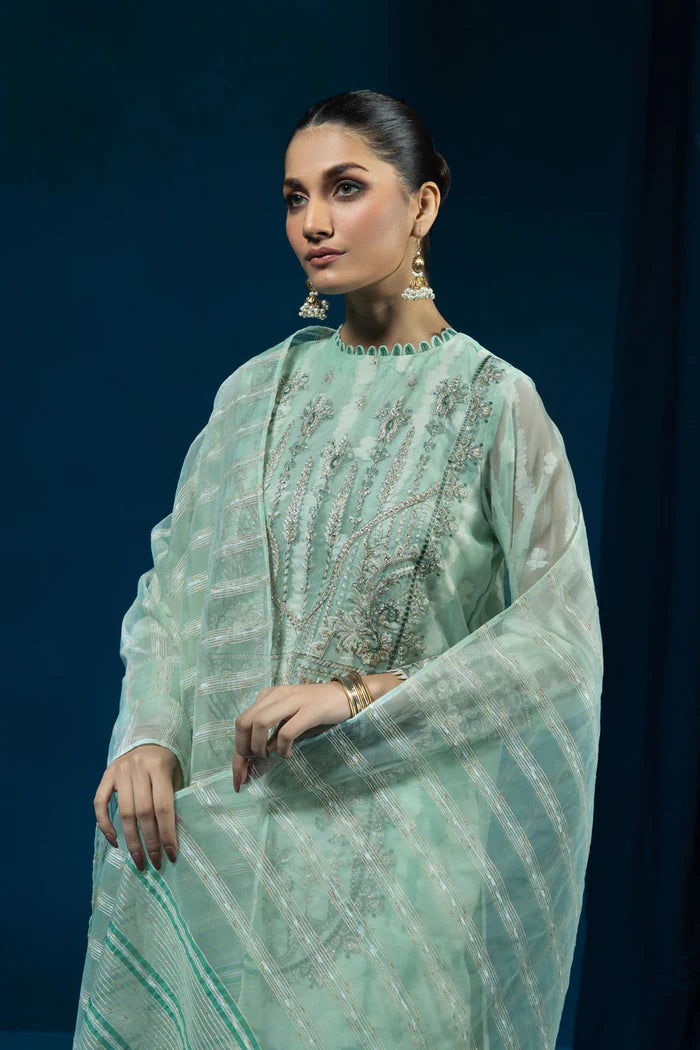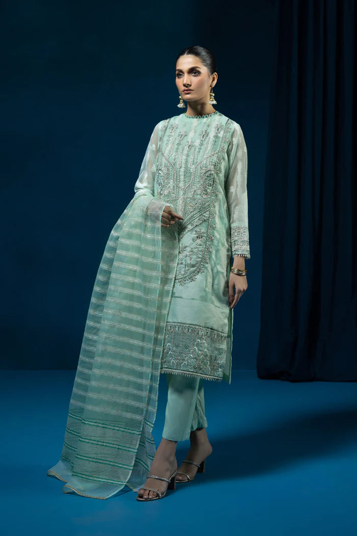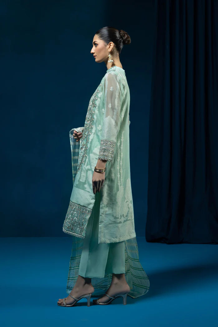 Envelope yourself in aqua green hues with this three-piece organza jacquard ensemble featuring exquisite detailing.