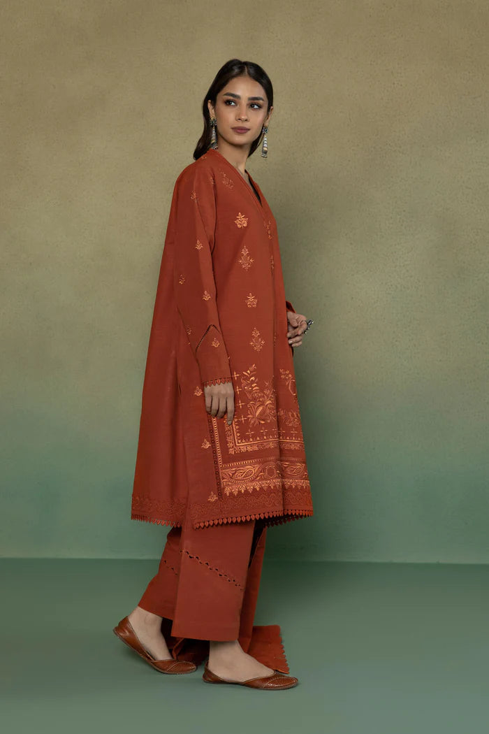 For a timeless grace adorn this rust hued khaddar ensemble featuring a matching shawl.