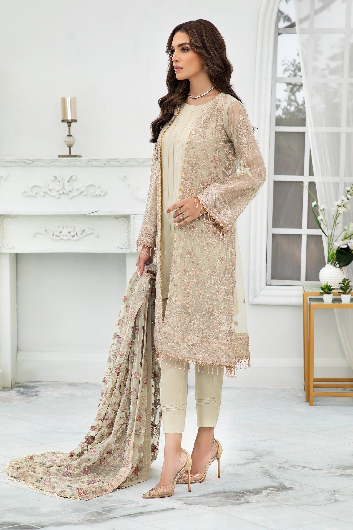 Artfully illustrated with single color embroidery on a subtle mint green canvas. This ensemble is a beauty to behold as it comes paired with a dupatta rendered in multi colored patterns of floral affair.