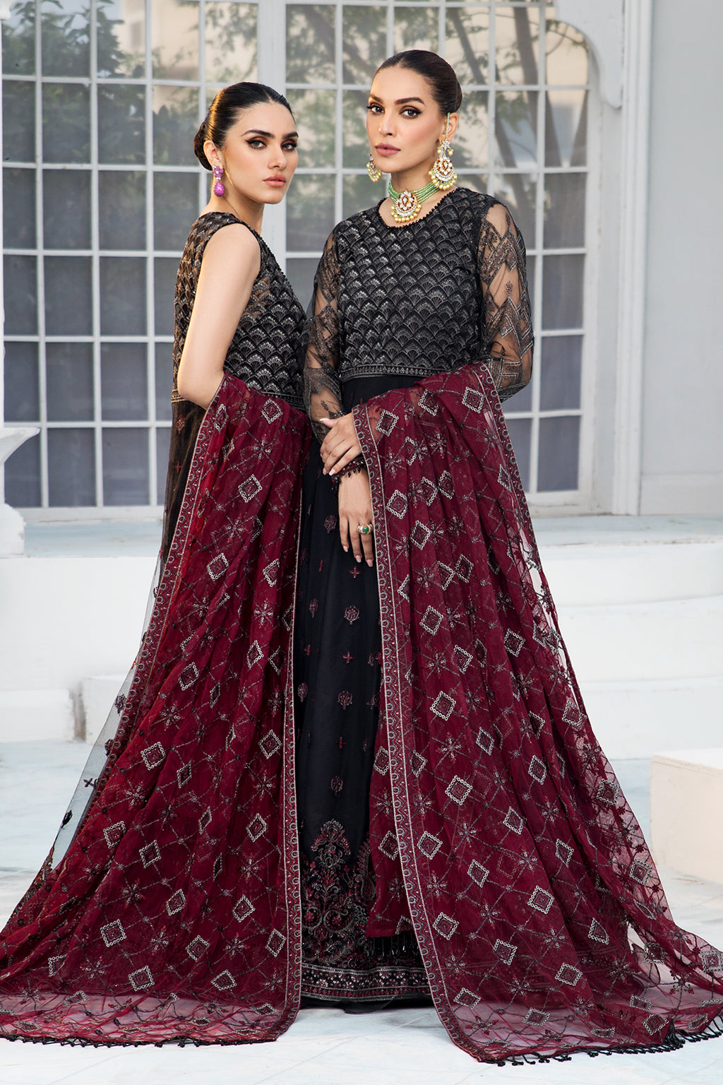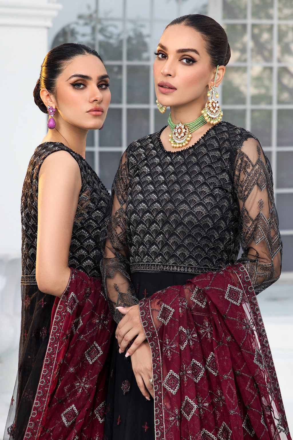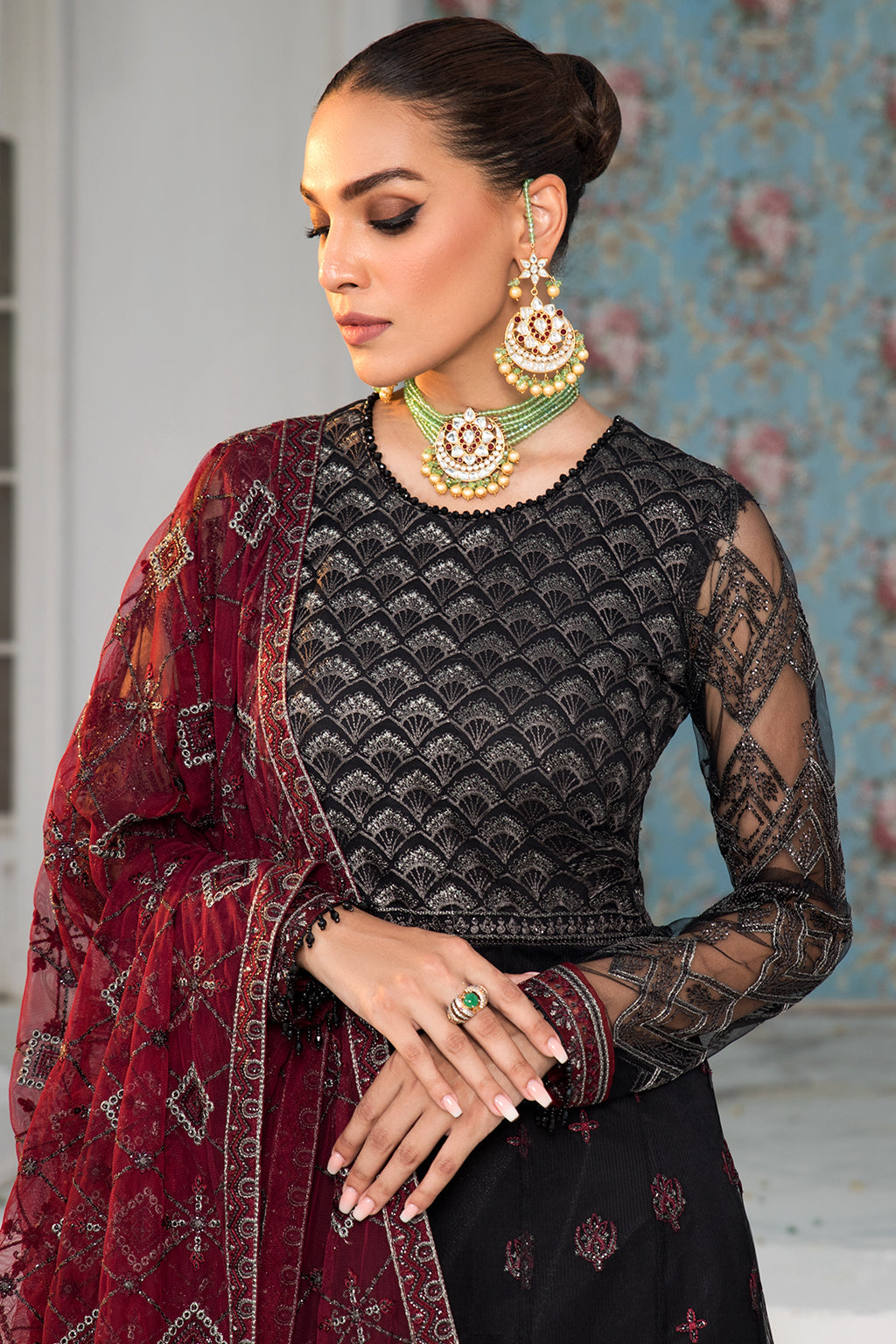 The airy canvas featuring lively embroideries on black base is a vision to behold. Its charm enhances when paired with a contrast maroon dupatta in finest work of art.