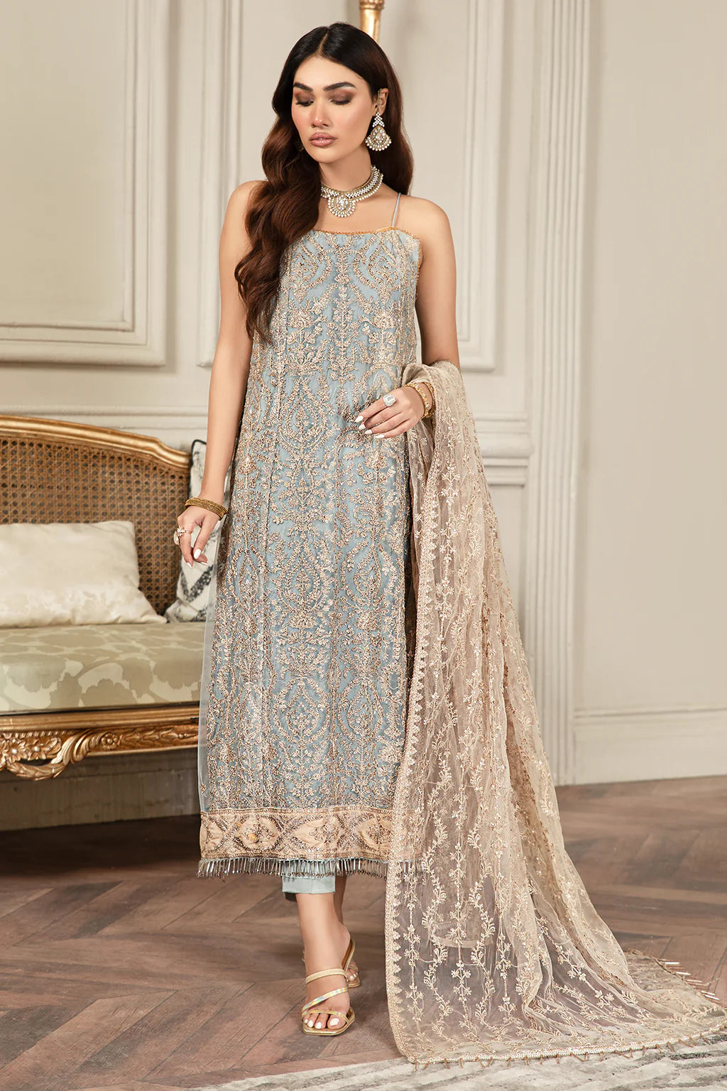 Beautifully adorned on ice blue surface, this attire is a vision to deem. Artistically created in contrasting embroideries of dull gold and matte sequins, this ensemble comes with a tonal trouser and contrasting dupatta in subtle beige color.