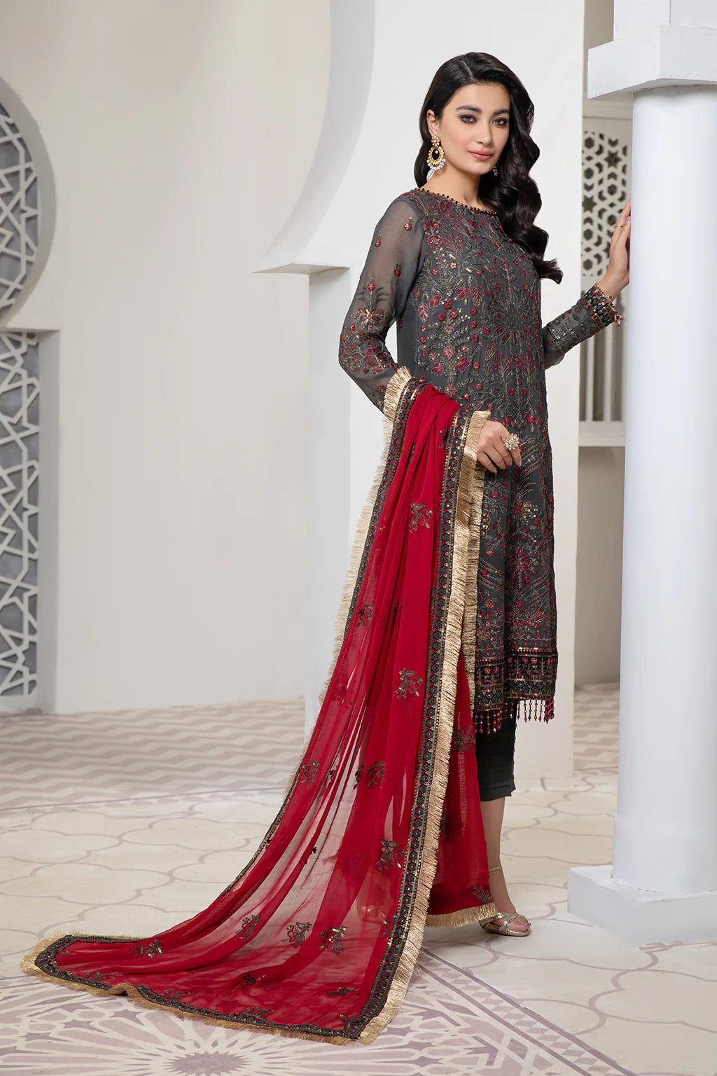 This ensemble is a combination of bold and gallant disposition of colours. Embroidered in artistically adorned thread work and matte gold sequins, it is a splendour to deem. This heavily embroidered surface comes paired with an embroidered dupatta and a tonal trouser making this a must have this ensemble this festive season.